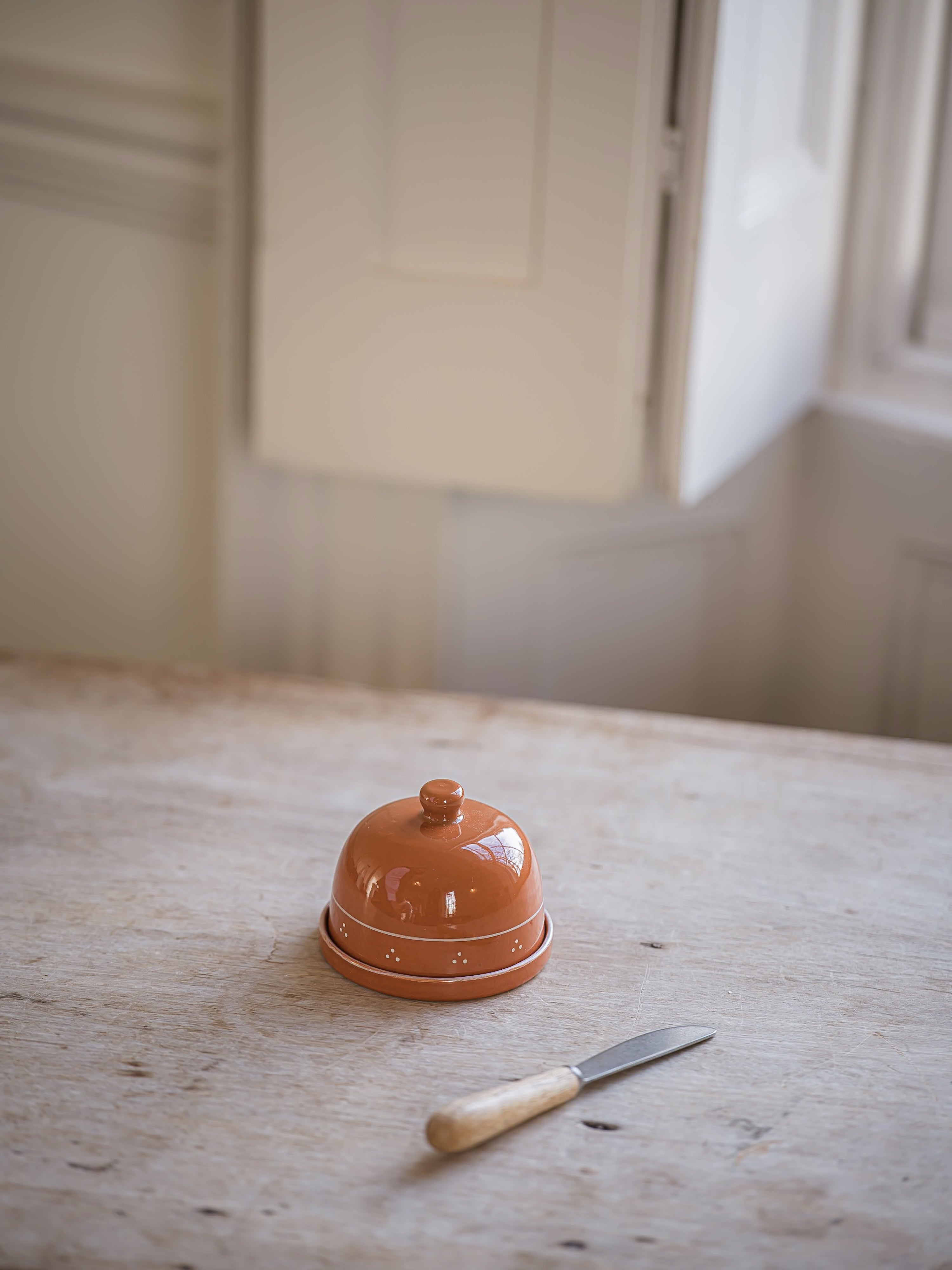 A stoneware butter dish inspired by vintage French market pottery. Crafted in small batches in a warm terracotta glaze, each piece is hand painted. The dish features a rounded form with a fitted lid, suitable for storing and serving butter on the table.