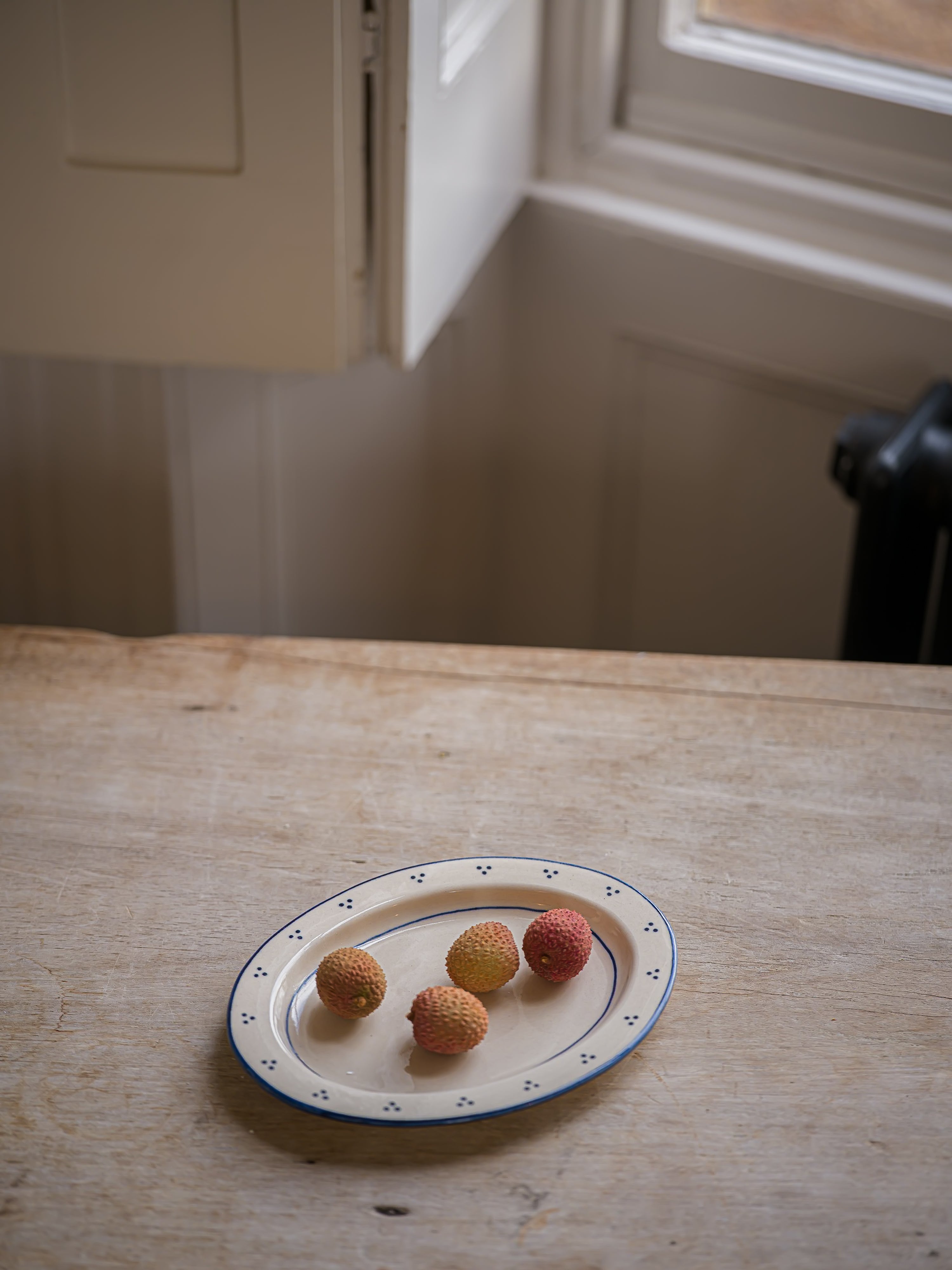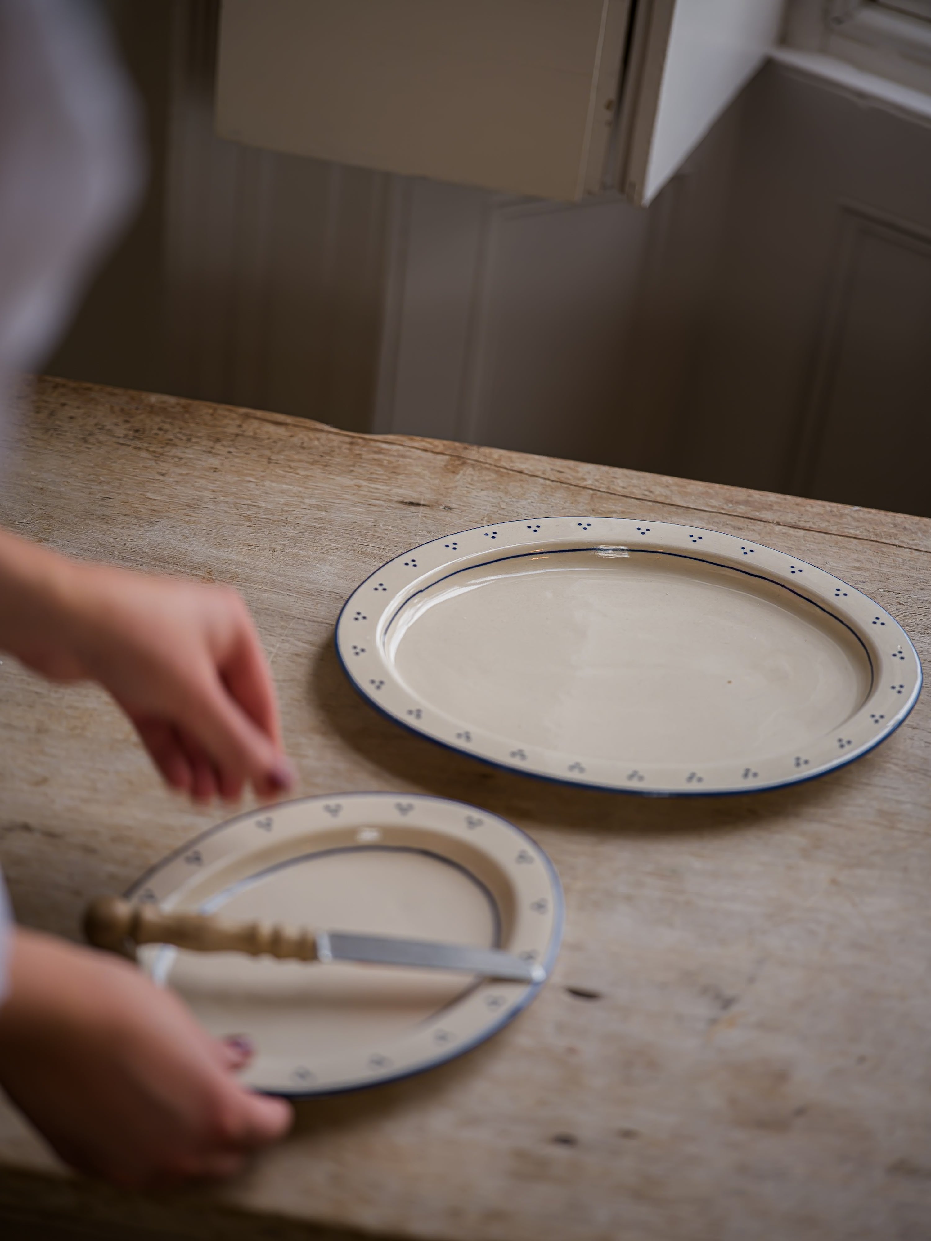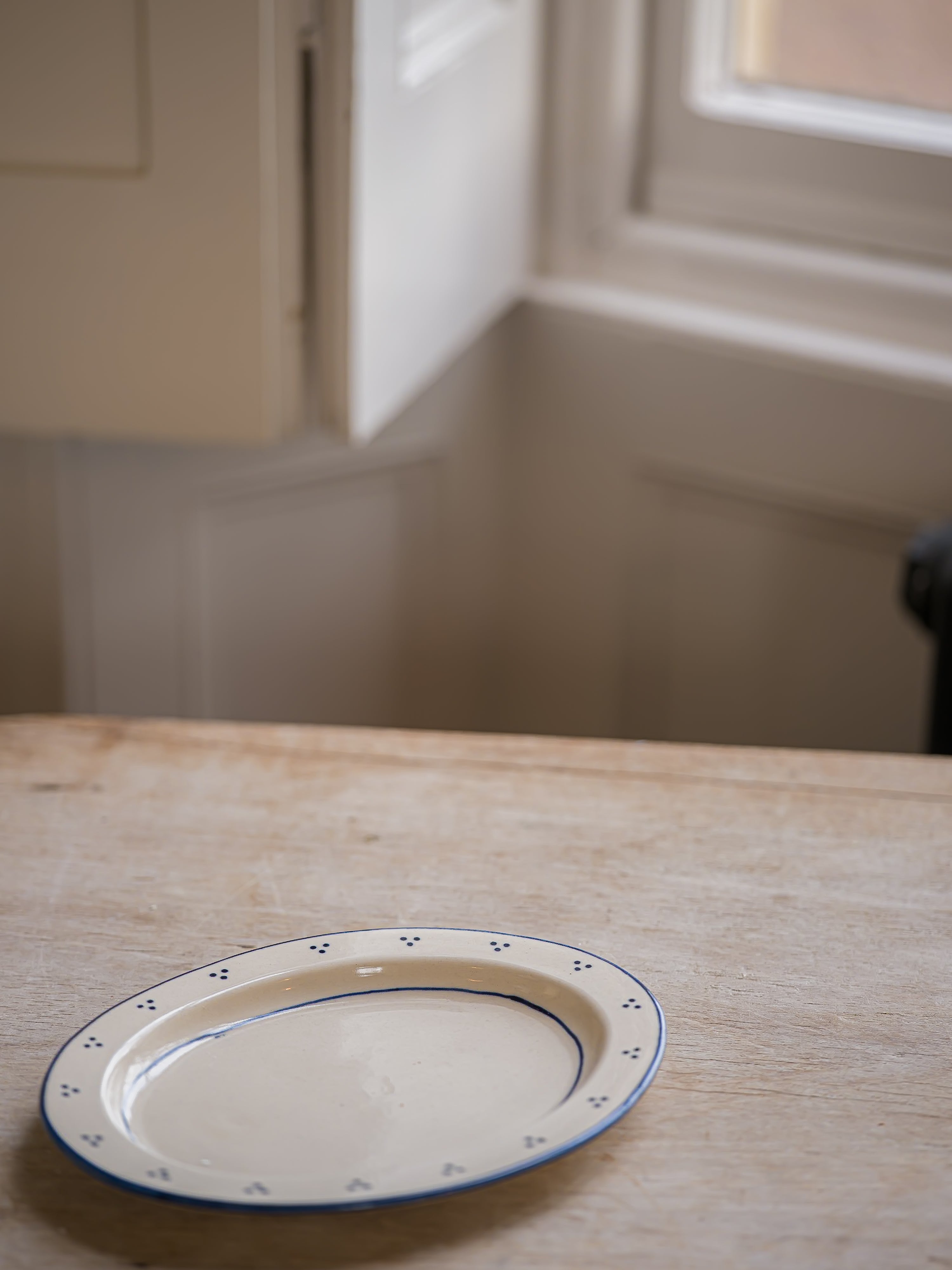 A stoneware small oval platter inspired by vintage French market pottery. Crafted in small batches in a soft cream glaze, each piece is hand painted. The platter’s petite oval shape makes it suitable for serving pastries, fruit or small bakes at the table.