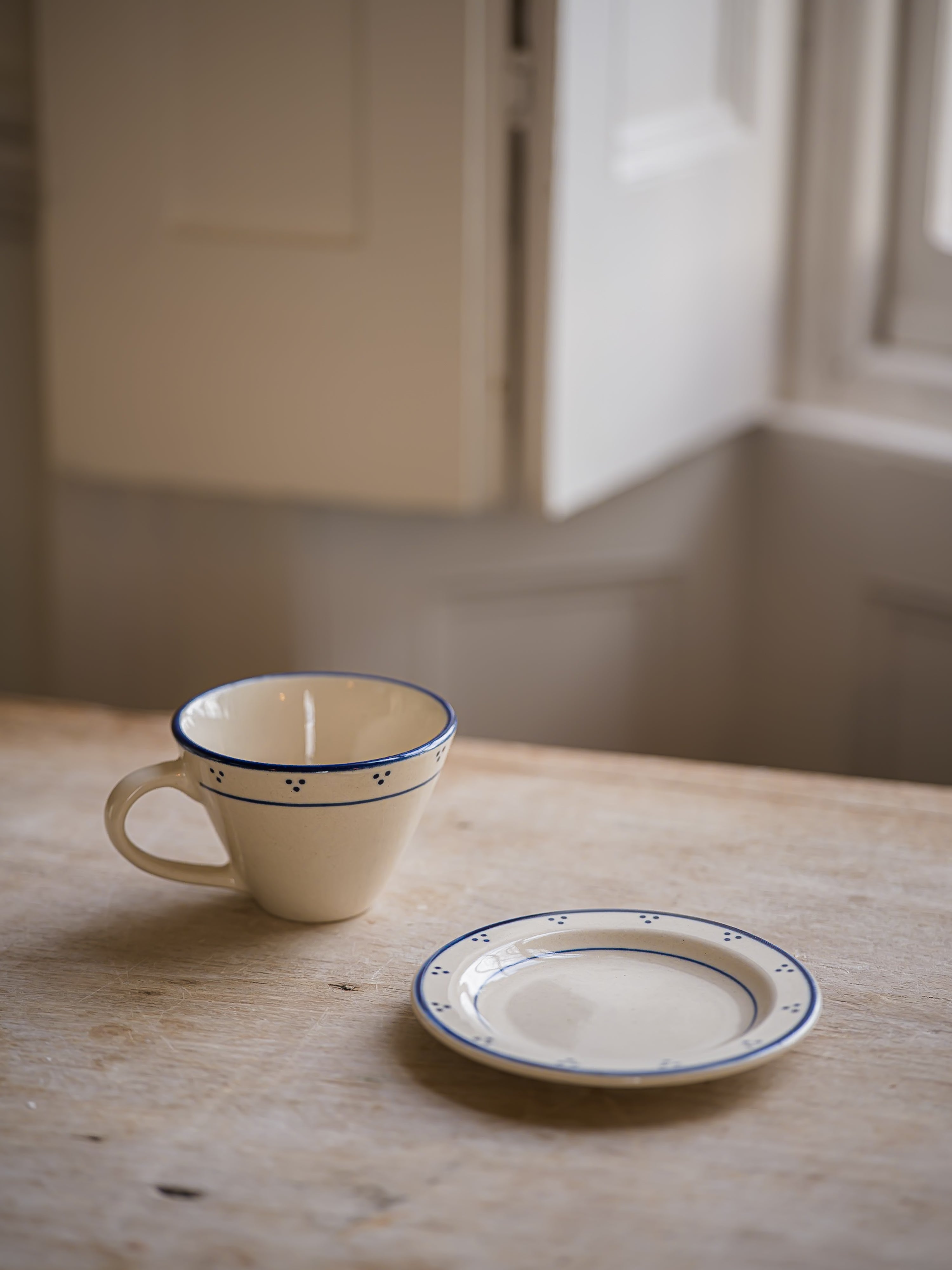 A stoneware tea cup and matching plate inspired by vintage French market pottery. Crafted in small batches in a soft cream glaze, each piece is hand painted. The cup has a rounded profile with a simple handle, paired with a plate suitable for small bakes or pastries.