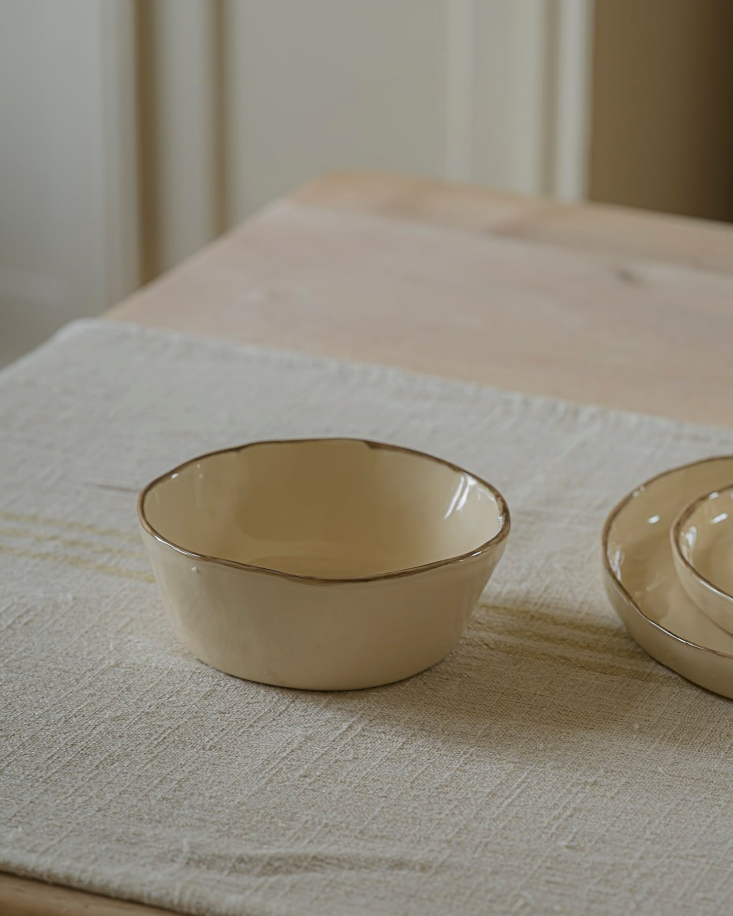The Porto Bowl is handcrafted in Portugal with softly organic shaping and a hand-finished edge. Each bowl is unique, with subtle variations in glaze that reflect its artisanal design. Offered in neutral tones with edge accents in soft blue and taupe.