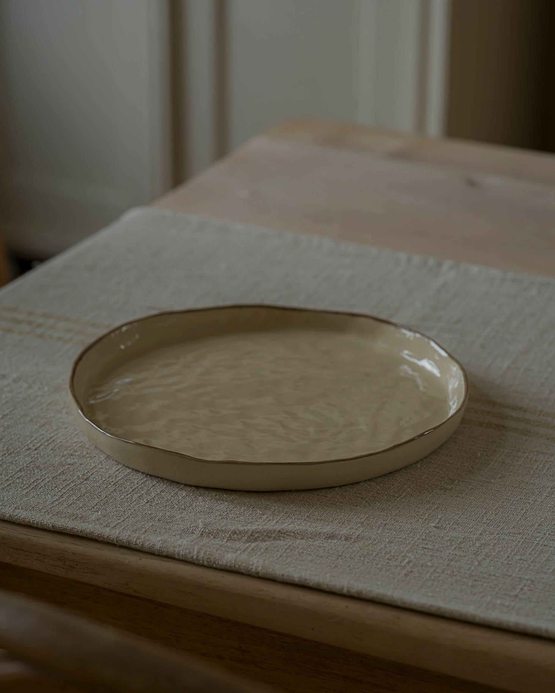 The Porto Dinner Plate is handcrafted in Portugal and finished with a hand-finished edge. Each plate is softly irregular in form, with subtle variations in grain and glaze making every piece unique. Available in neutral tones with edge accents in soft blue and taupe.
