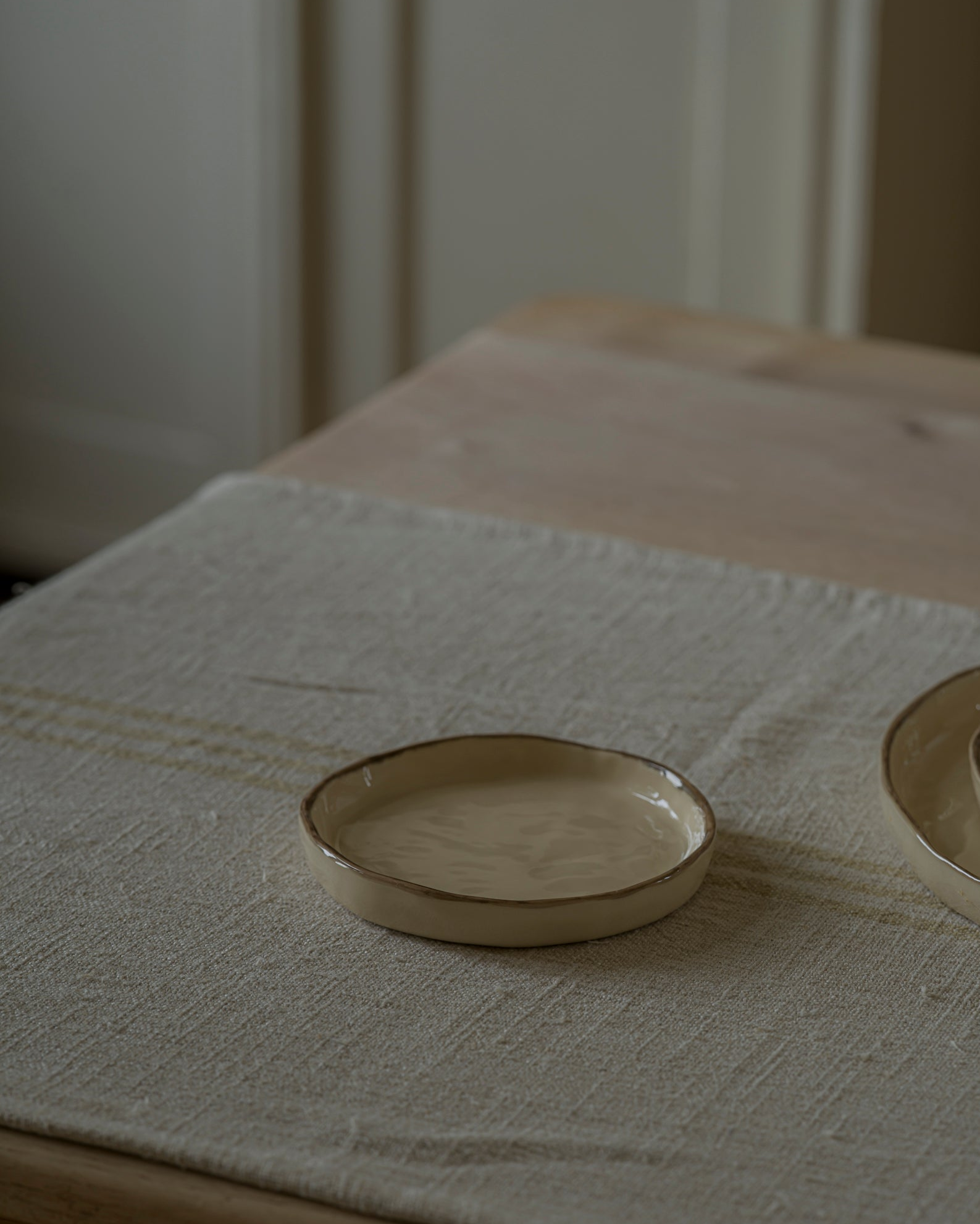 The Porto Snack Plate is crafted in Portugal, combining softly irregular shaping with a hand-finished edge. Each piece has natural variations that highlight artisanal craftsmanship. Available in neutral tones with subtle accents in soft blue and taupe.