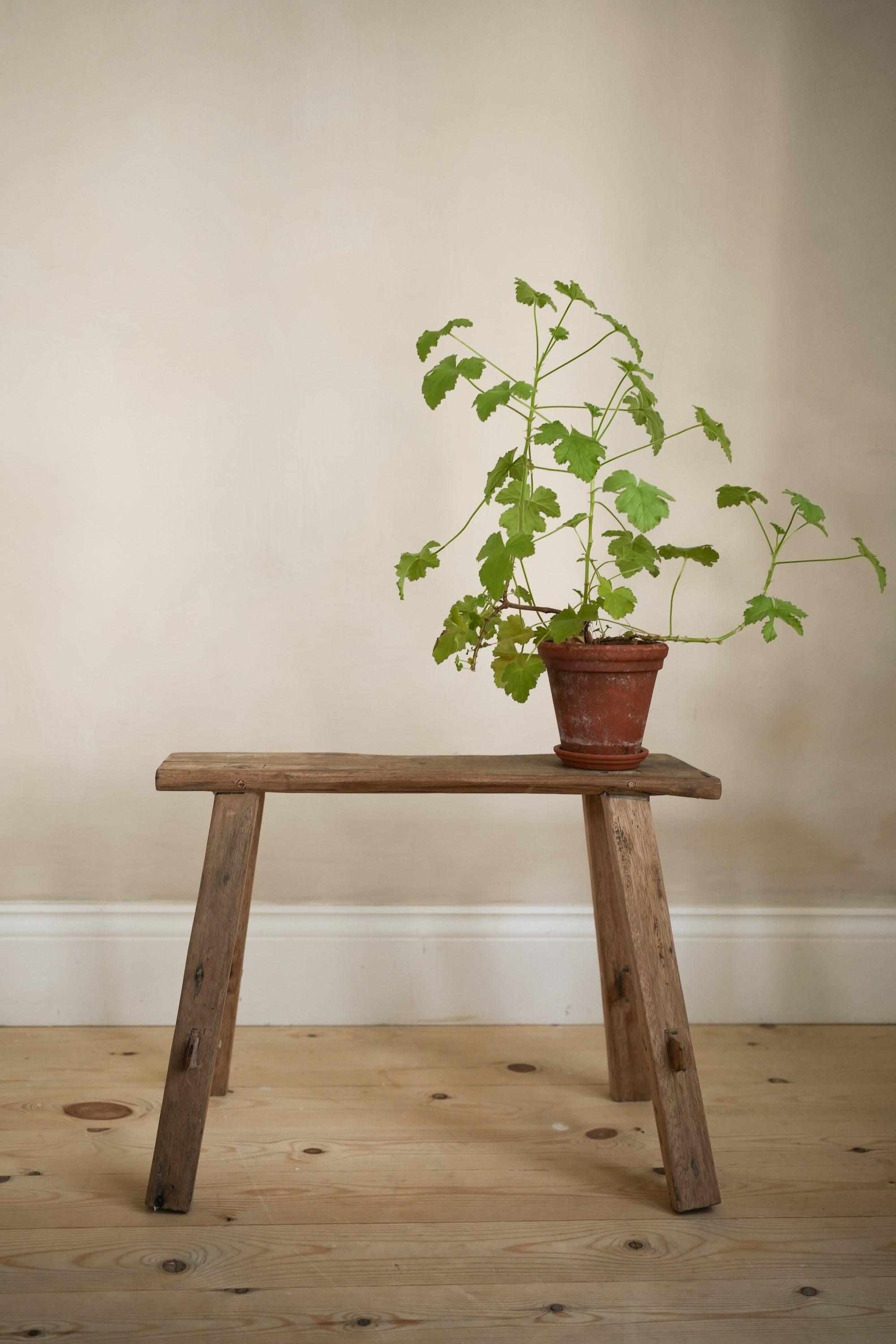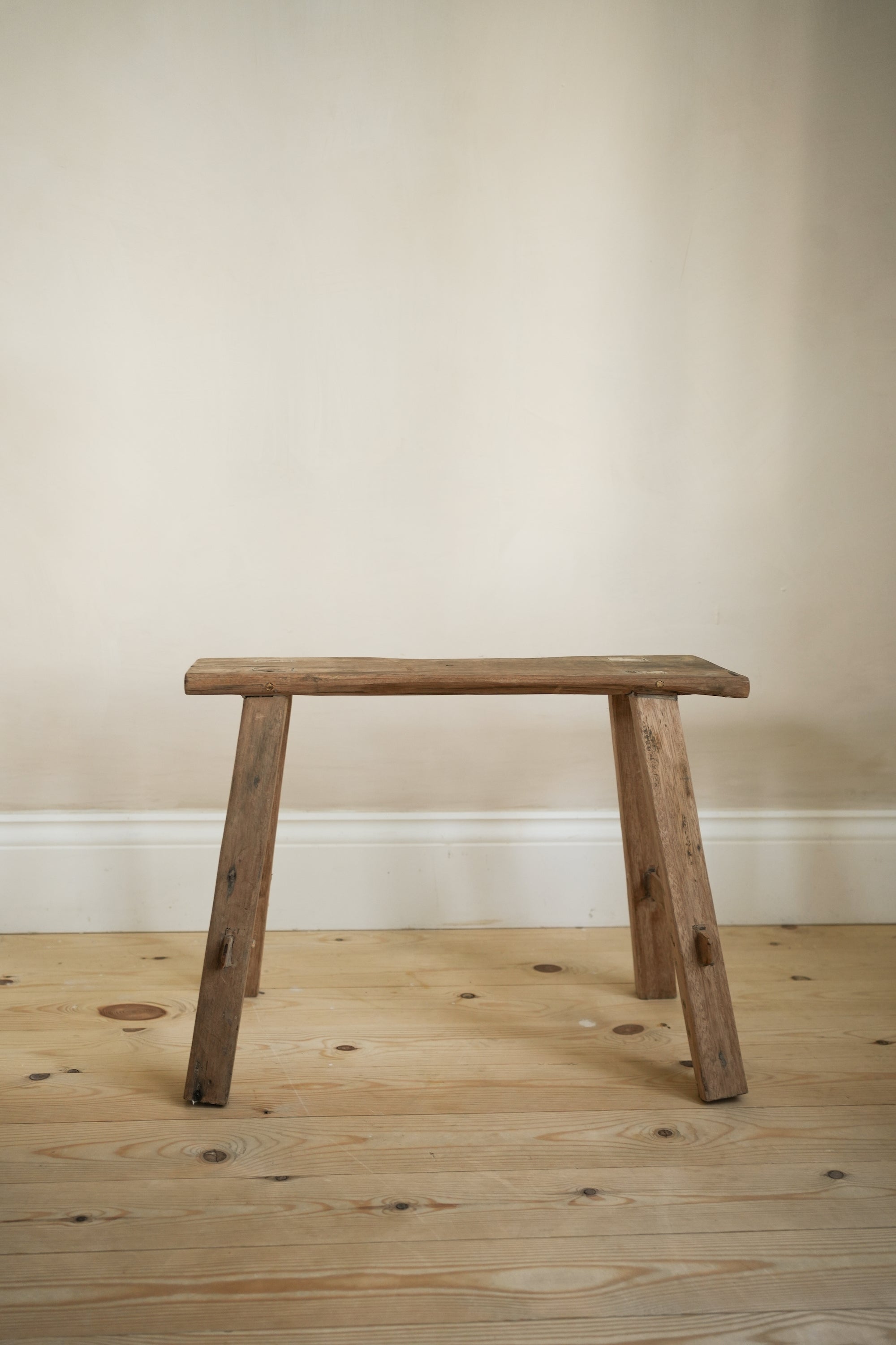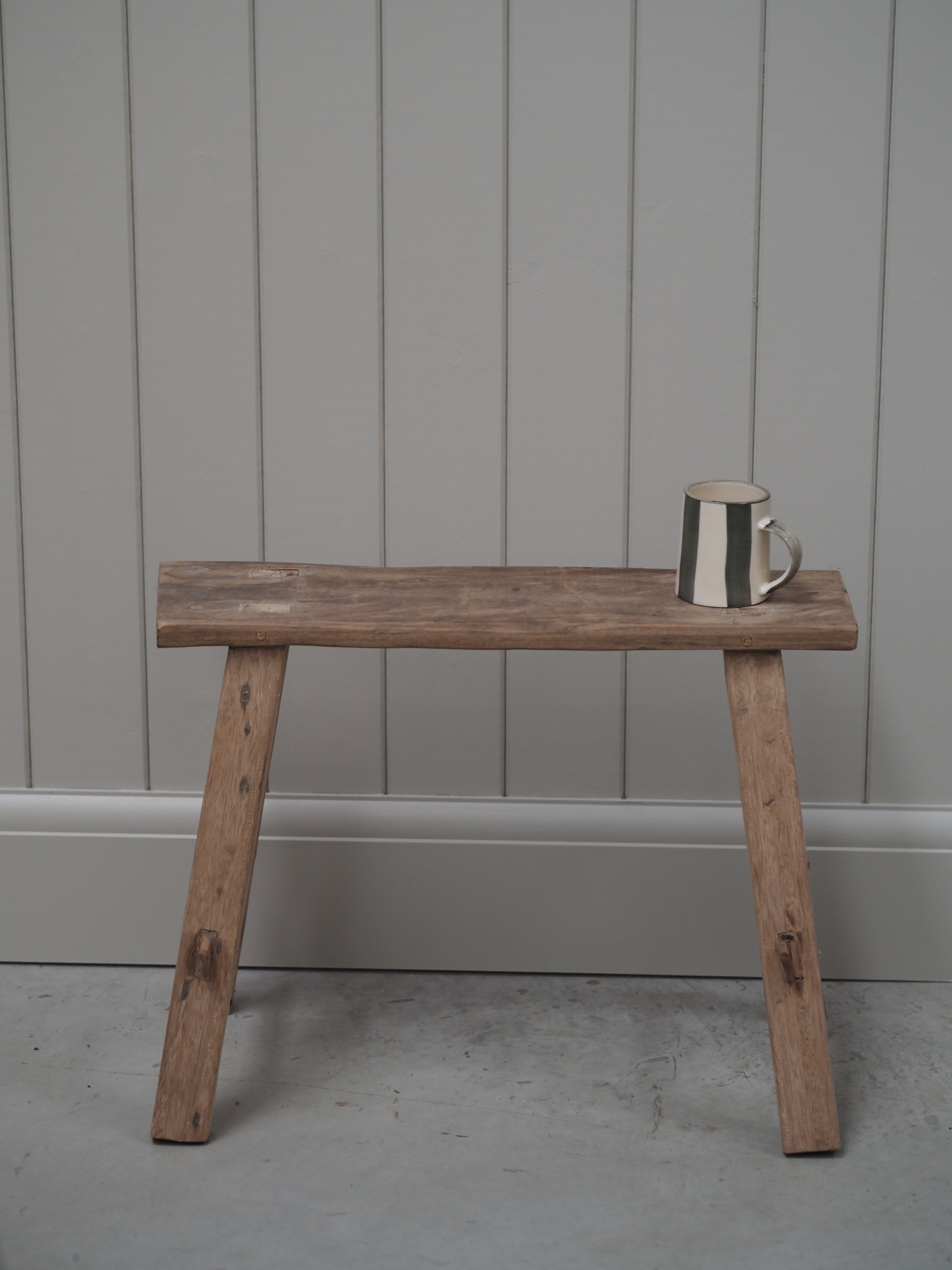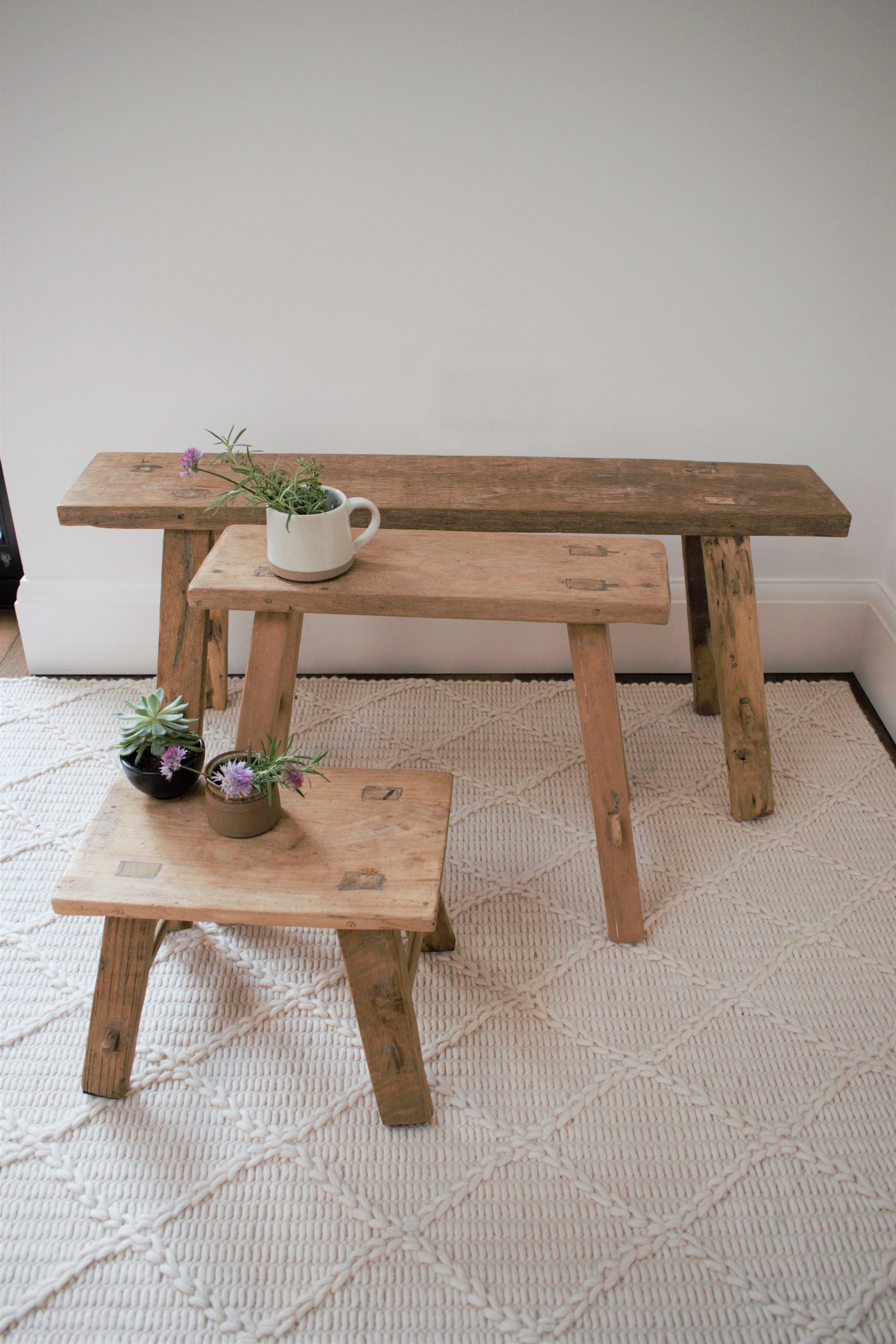 A bench hand made from recycled antique boat wood. This sweet yet chic little bench is great for putting plants on, using as a step or in a child's room.