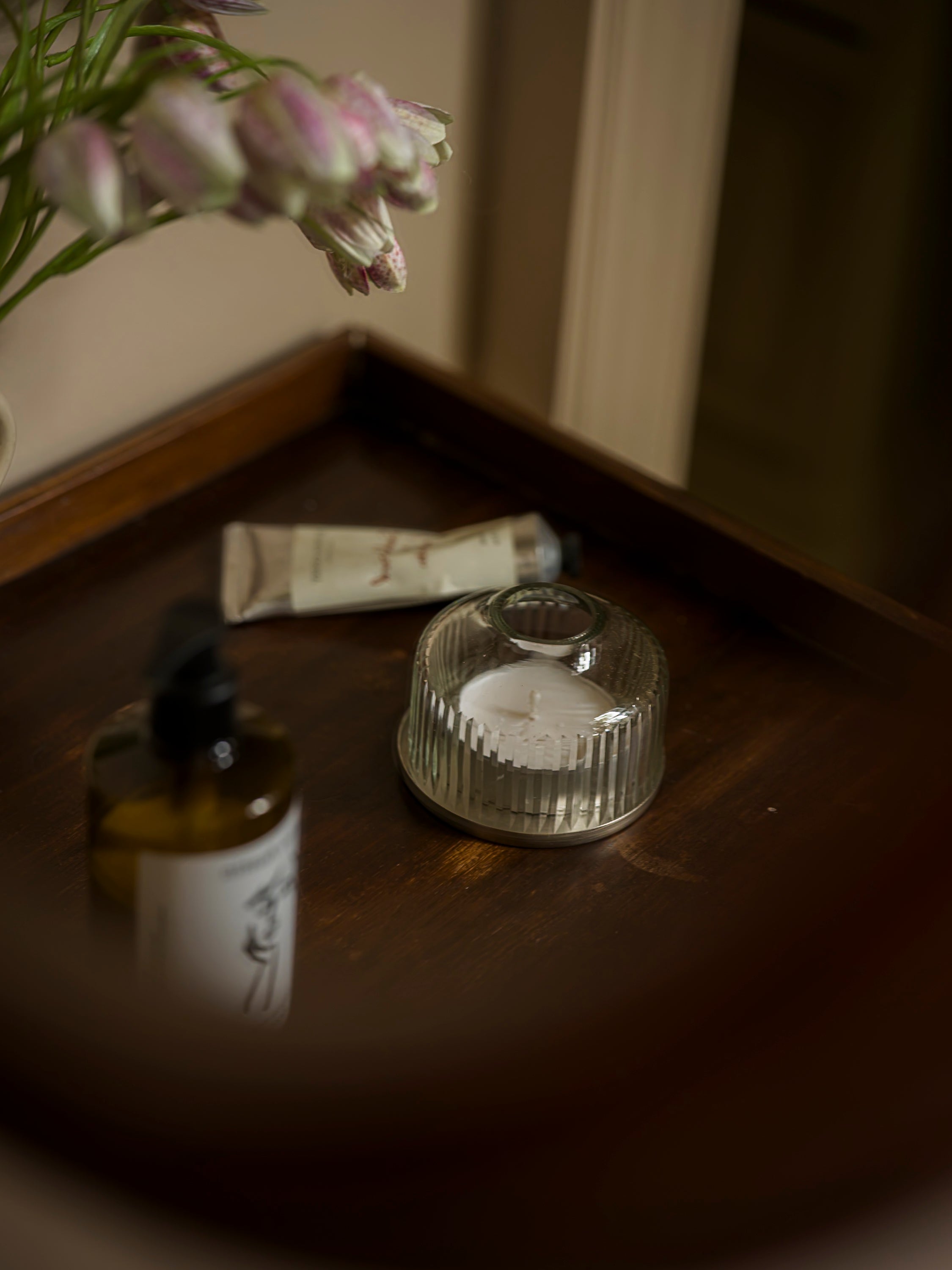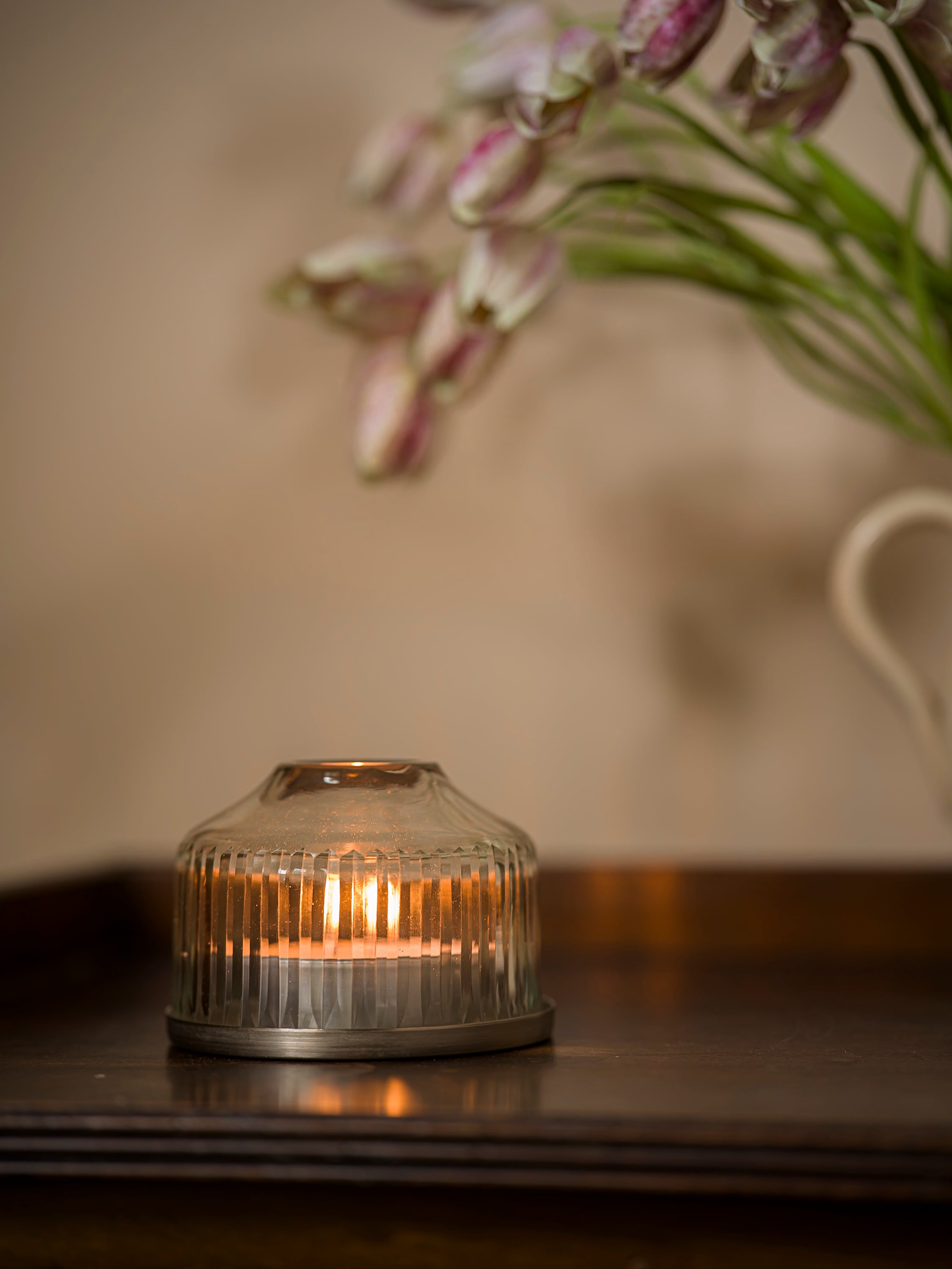 This small handblown glass candle dome features delicate reeded detailing, adding gentle texture that softly diffuses the flicker of candlelight. The vertical lines are cut by hand, creating a subtle, rhythmic pattern that honours traditional craftsmanship and refined simplicity.