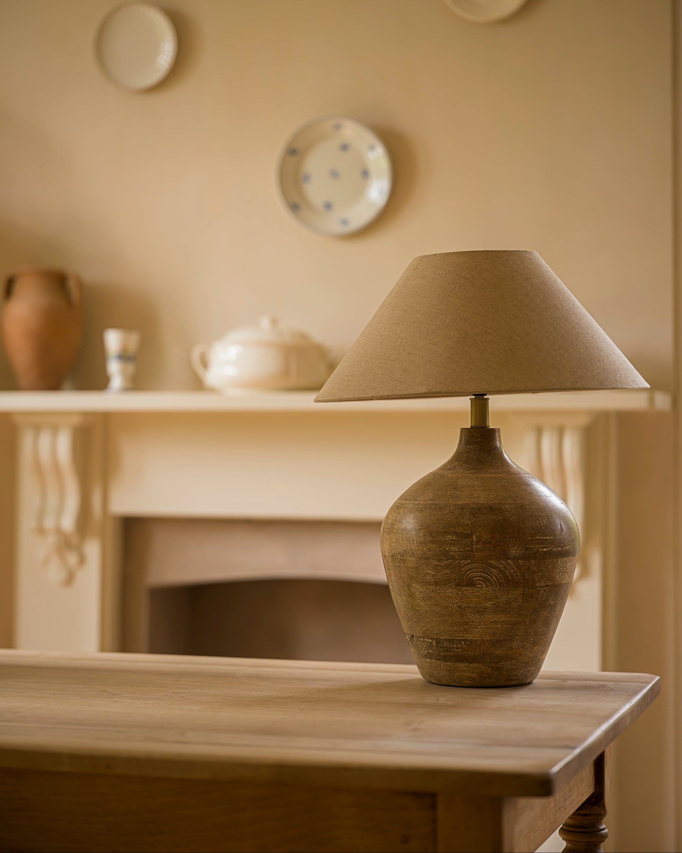 The Salcombe Urn Lamp features a hand-carved wooden base in a classic urn design, celebrating the natural warmth and texture of the wood. Each piece is individually crafted, with subtle variations in grain and tone making every lamp unique. Designed to be styled with a natural linen shade, it sits beautifully on consoles, sideboards or larger bedsides.