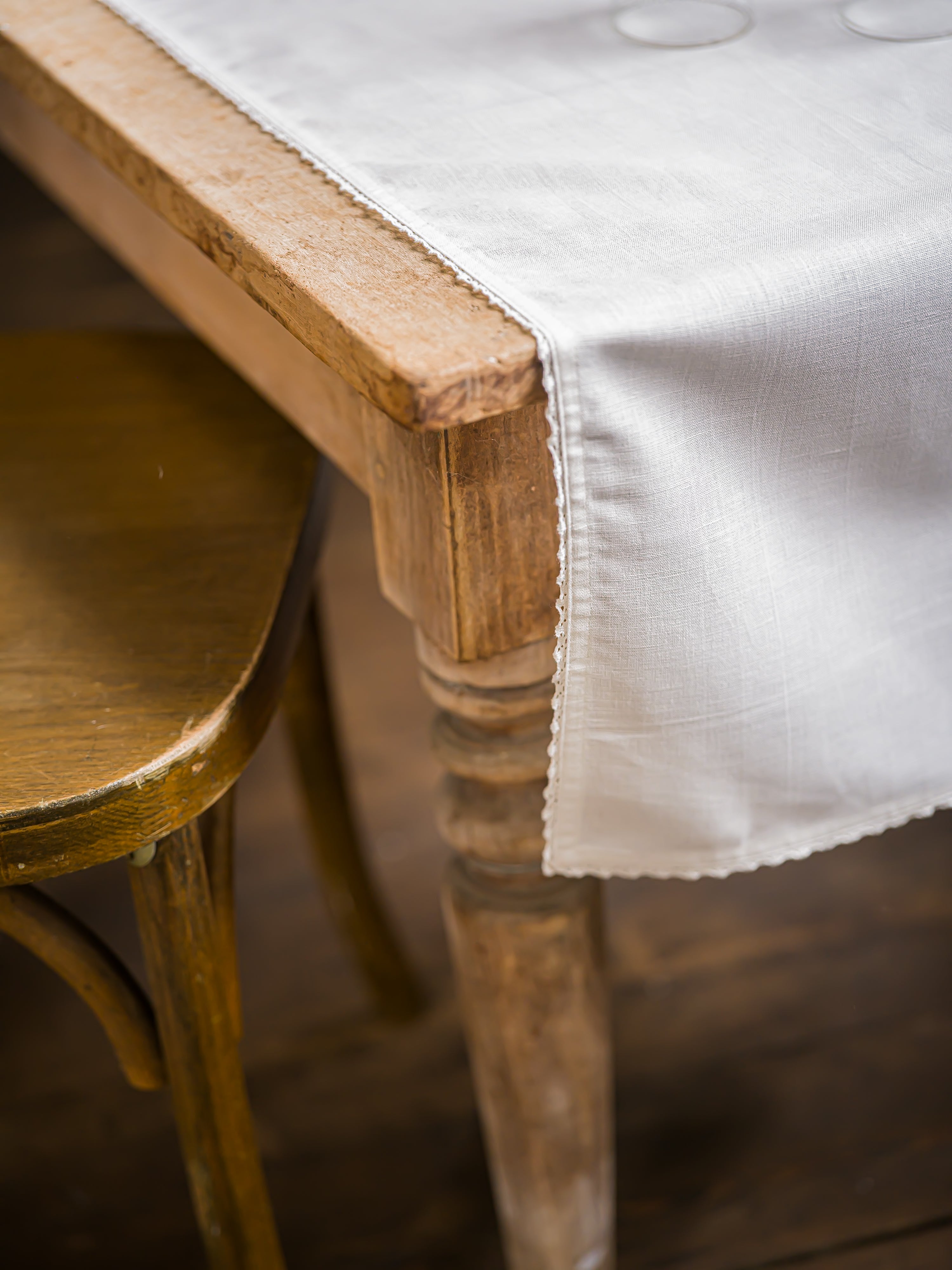 Crafted from white linen and finished with a delicate lace trim. Designed to offer a soft, neutral and timeless base for a wide range of table settings.