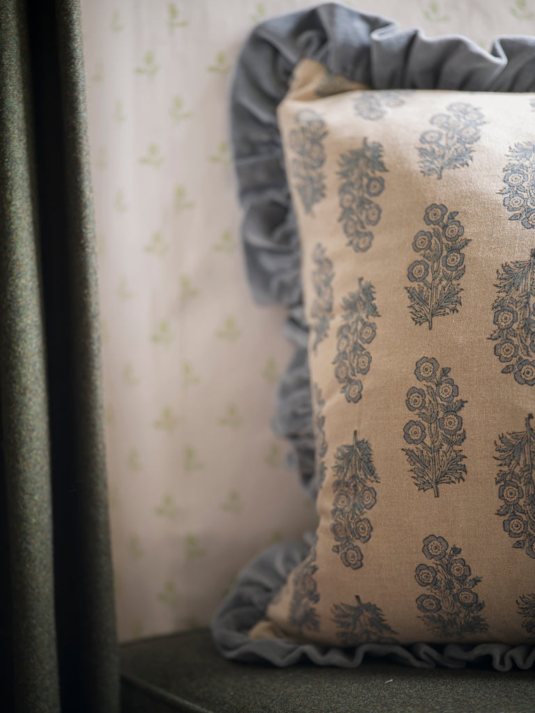 An elegant piece celebrating traditional artisan block printing with a romantic floral design, the complimentary velvet ruffle adding to the charm and helps to elevate the look.
