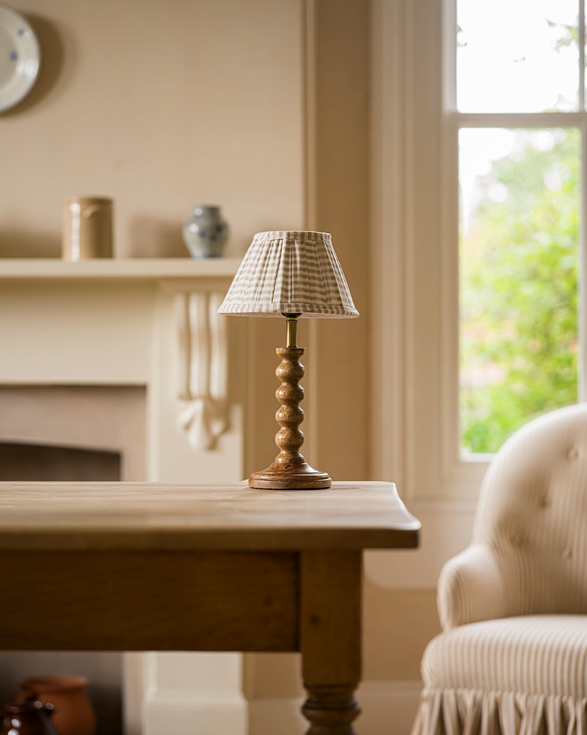 The Bobbin Table Lamp features hand-turned wooden detailing and a natural finish, crafted by skilled artisans to highlight the beauty of the wood. With subtle variations in grain and tone, each piece is unique. Designed as a base to be styled with our pleated shades (sold separately), it’s a versatile lamp for bedsides, desks, and side tables.