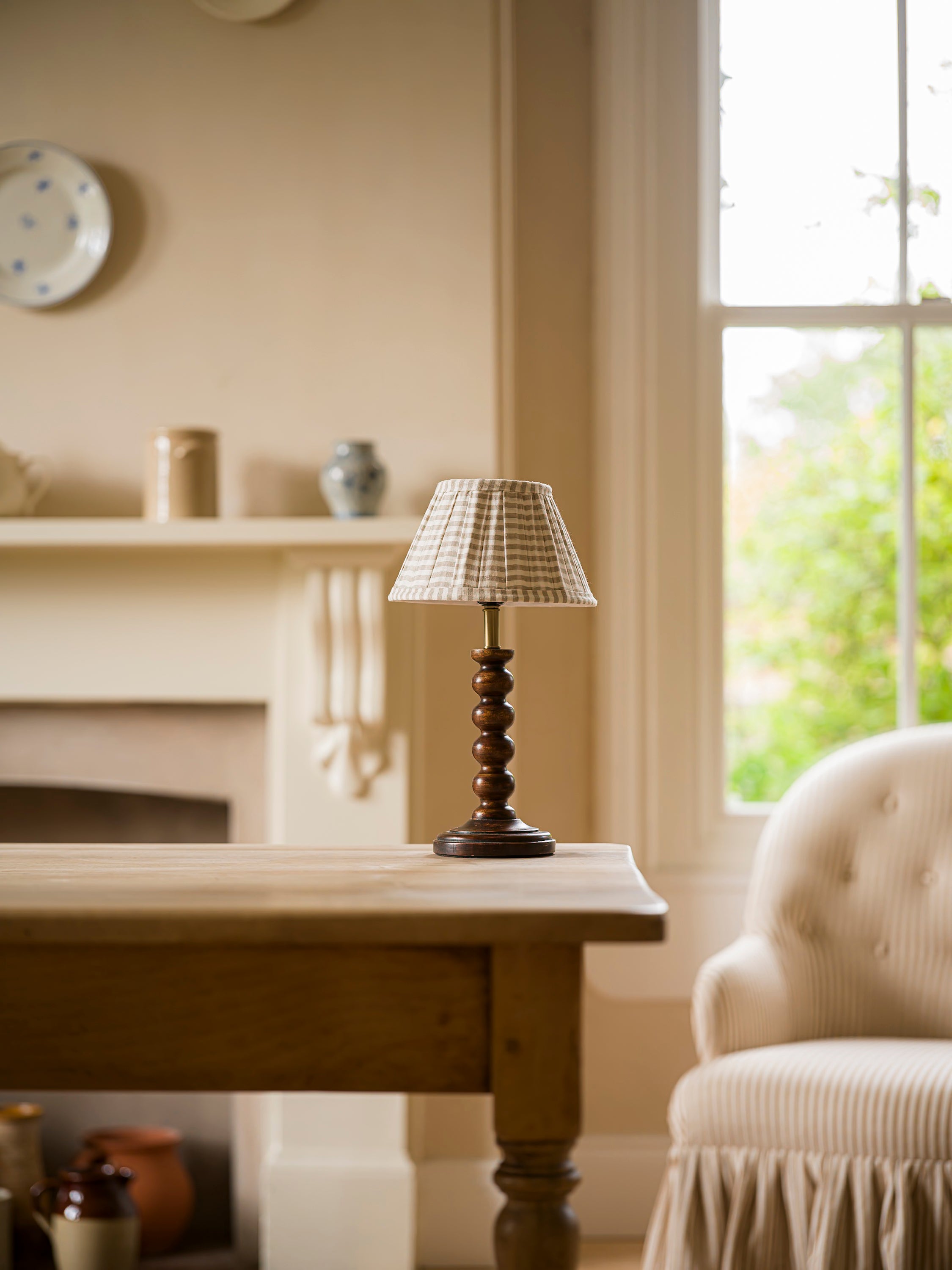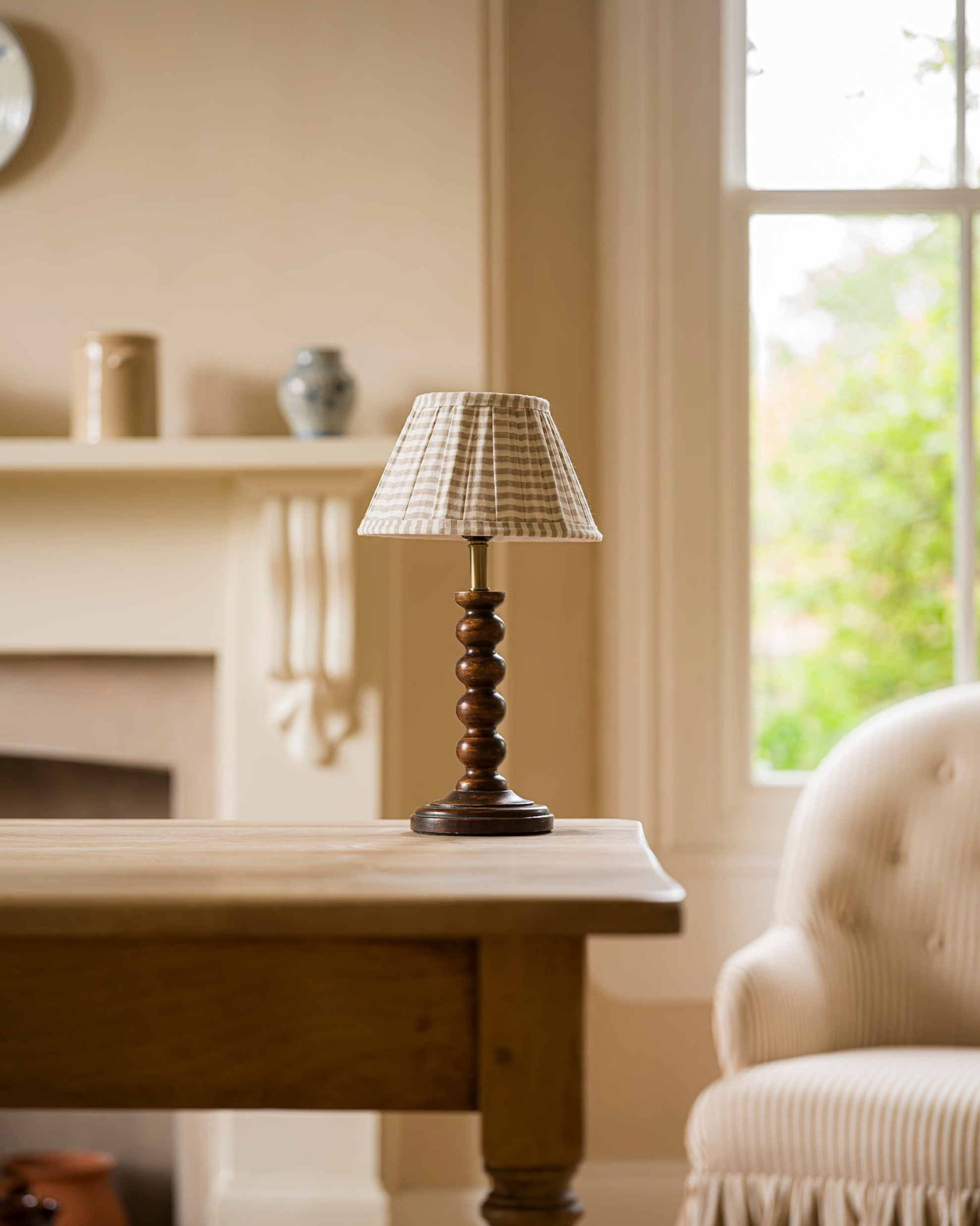 The Bobbin Table Lamp features hand-turned wooden detailing and a natural finish, crafted by skilled artisans to highlight the beauty of the wood. With subtle variations in grain and tone, each piece is unique. Designed as a base to be styled with our pleated shades (sold separately), it’s a versatile lamp for bedsides, desks, and side tables.