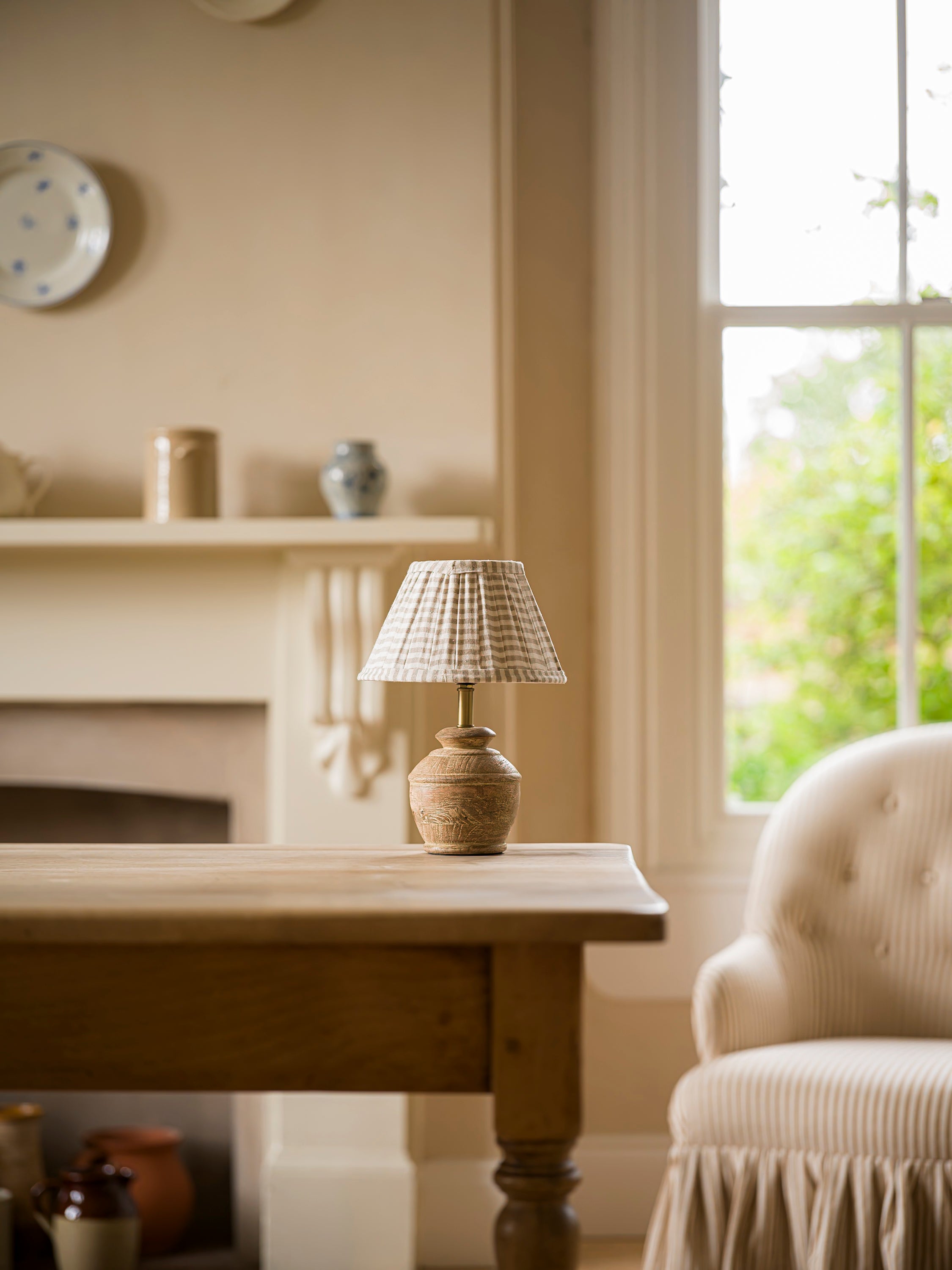 The Burford Turned Lamp – Petite is a small yet characterful wooden lamp base, hand-carved by skilled artisans to highlight the natural warmth of the wood. Subtle variations in grain and finish ensure each piece is unique, celebrating the beauty of the natural material.
