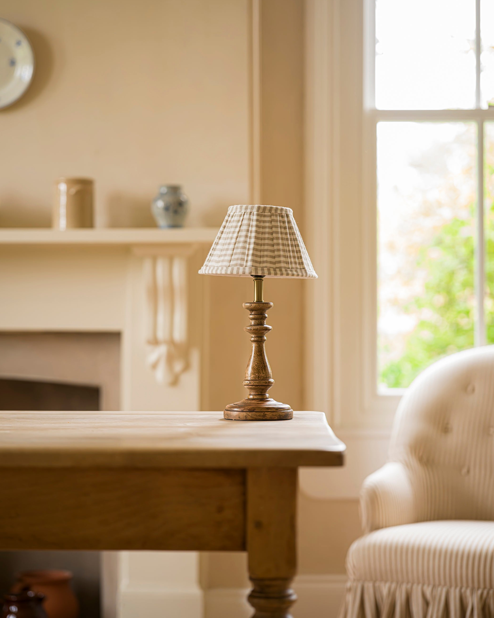 The Candleford Table Lamp is a timeless wooden base with a rich walnut finish, hand-carved by skilled artisans to celebrate the natural beauty of the wood. Subtle variations in grain and colour ensure each piece is unique, bringing warmth and character to the home. Designed as a base to be styled with our pleated shades (sold separately), it is perfectly suited to bedsides, side tables, and desks.