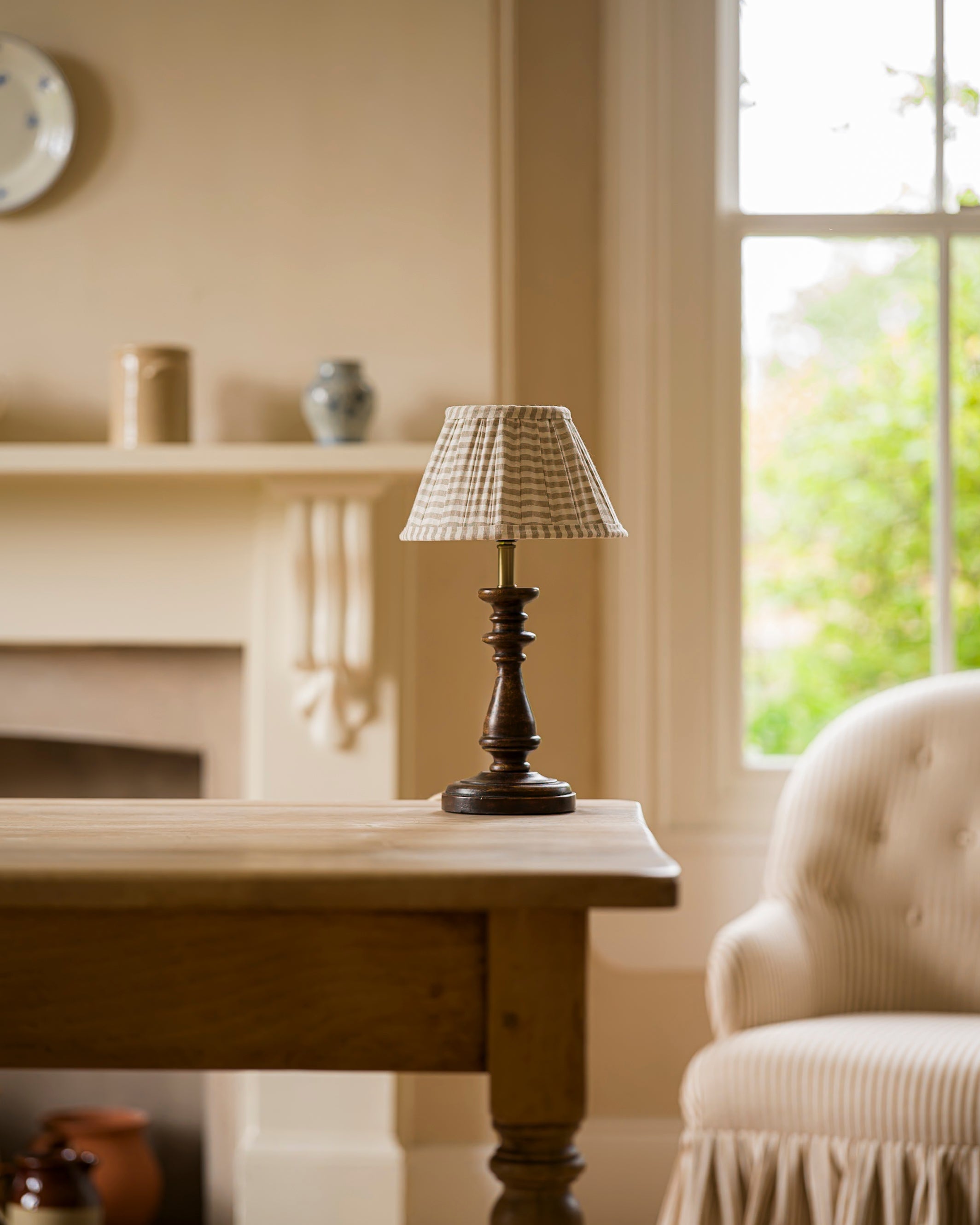 The Candleford Table Lamp is a timeless wooden base with a rich walnut finish, hand-carved by skilled artisans to celebrate the natural beauty of the wood. Subtle variations in grain and colour ensure each piece is unique, bringing warmth and character to the home. Designed as a base to be styled with our pleated shades (sold separately), it is perfectly suited to bedsides, side tables, and desks.