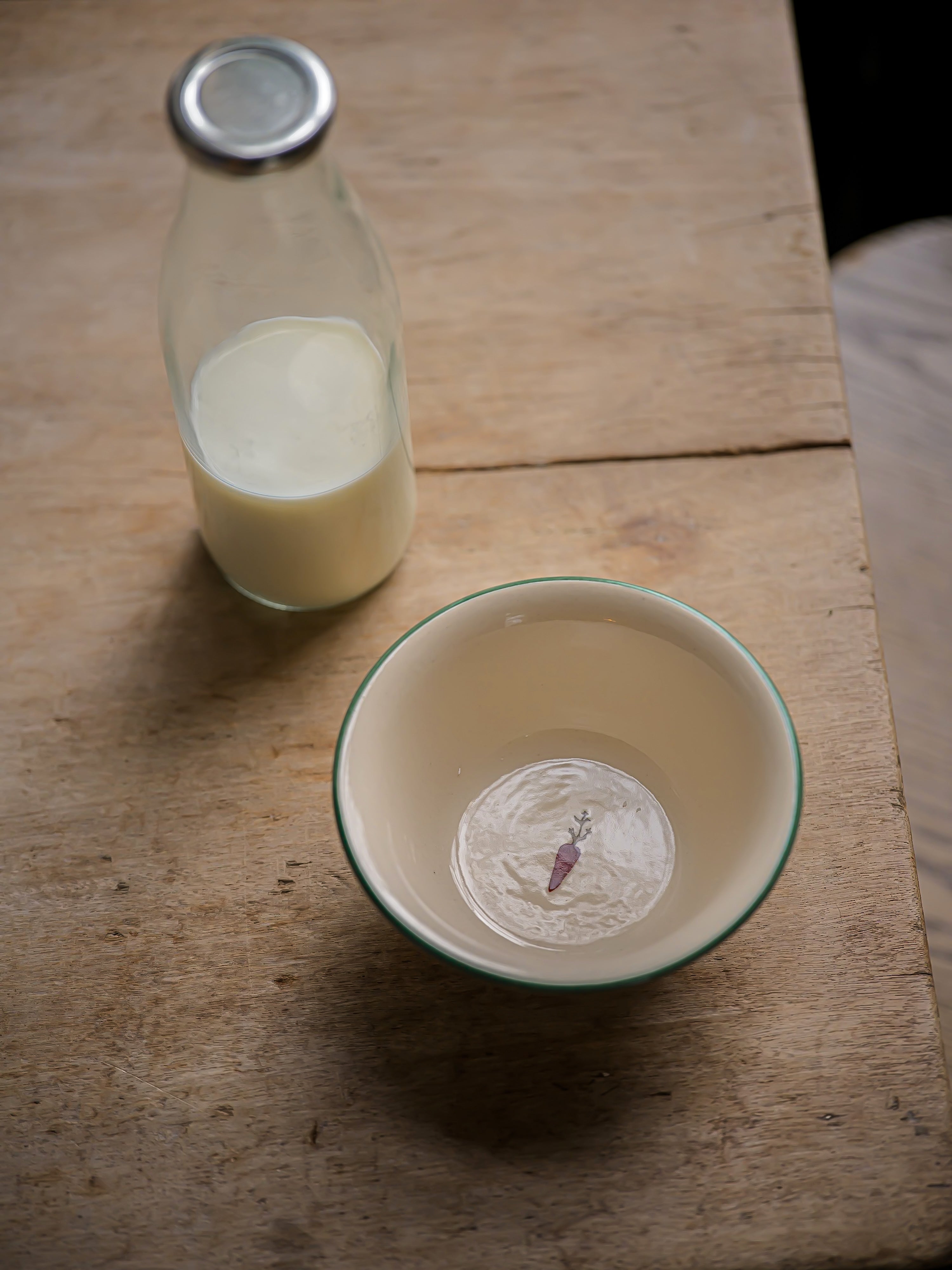 A hand-painted stoneware bowl inspired by the charm of traditional kitchen gardens. This bowl is finished with a warm, cream-toned glaze and a soft green rim, and is hand painted with a carrot illustration.
