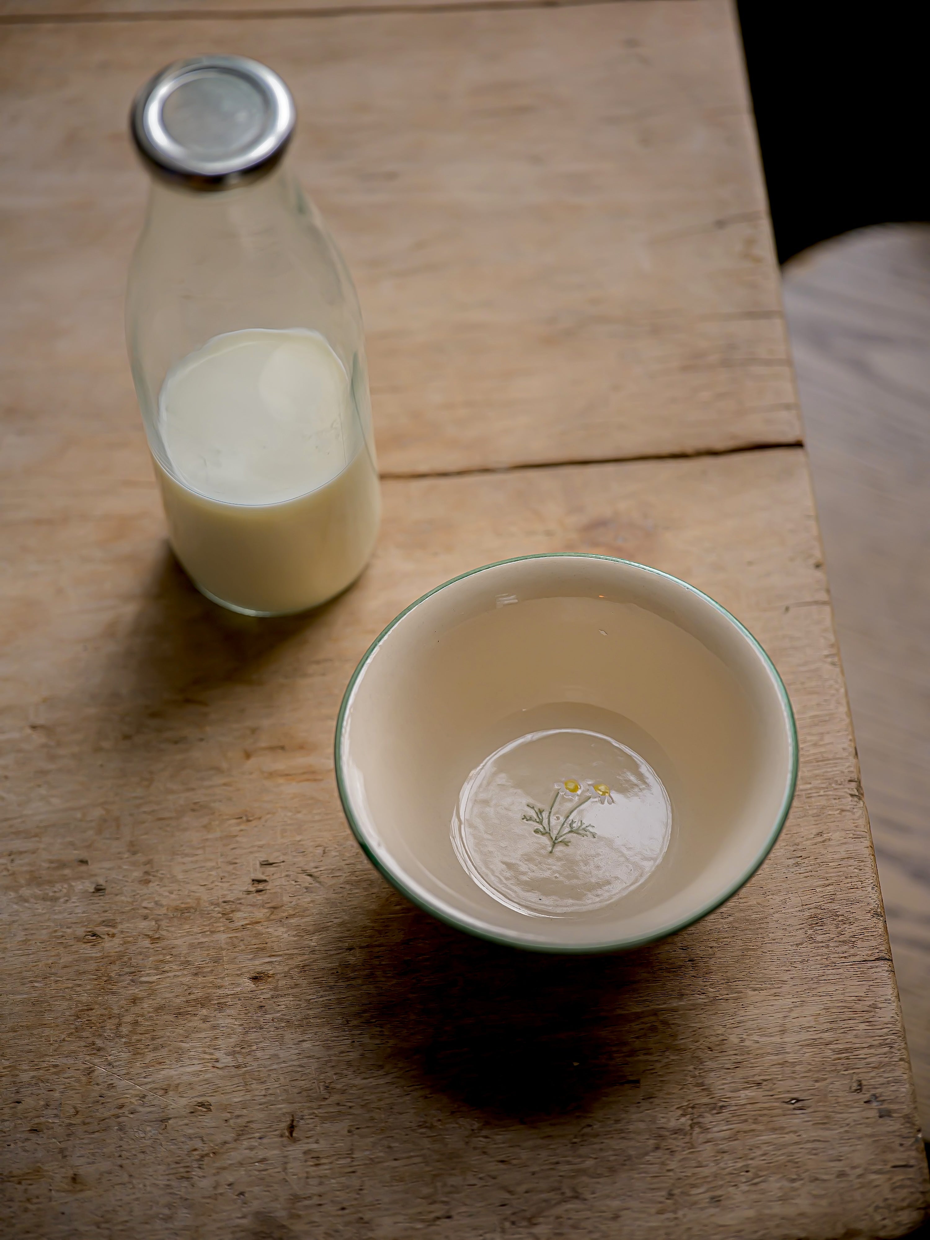 A hand-painted stoneware bowl inspired by the charm of traditional kitchen gardens. This bowl is finished with a warm, cream-toned glaze and a soft green rim, and is hand painted with a chamomile illustration.