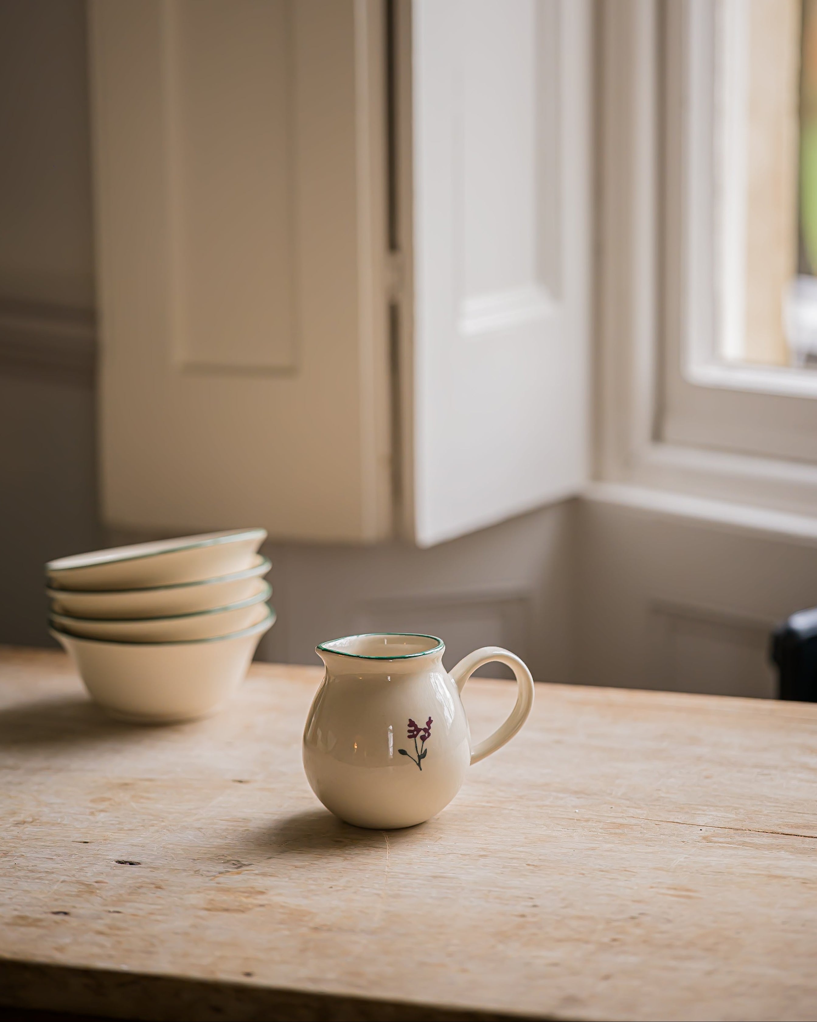 A hand-painted stoneware jug inspired by the charm of traditional kitchen gardens. This jug is finished with a warm, cream-toned glaze and a soft green rim, and is hand painted with a lavender illustration.