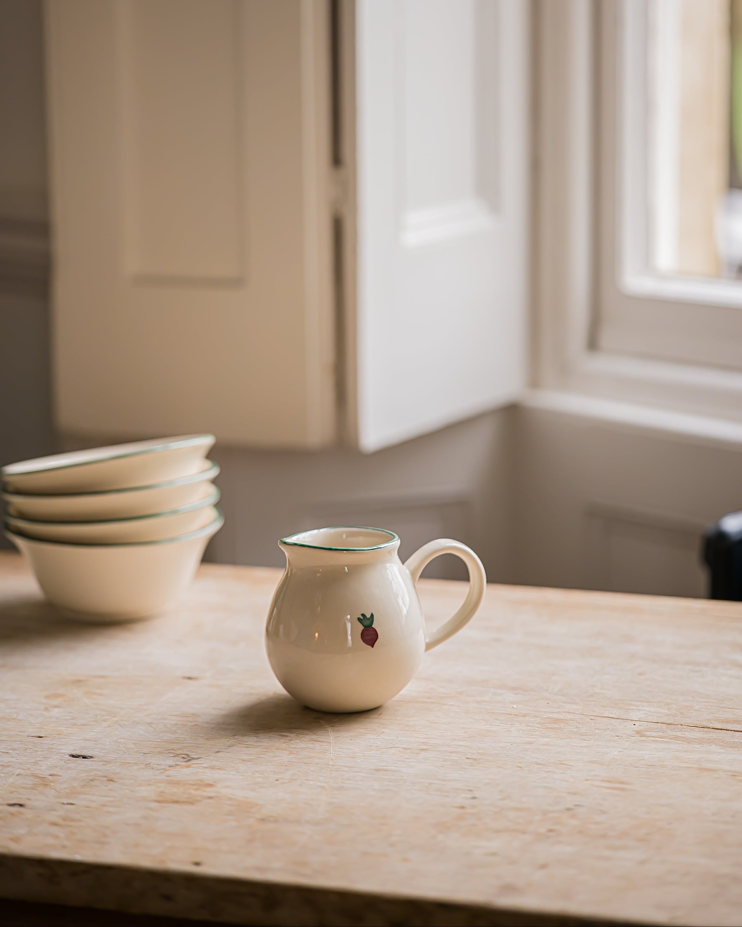 A hand-painted stoneware jug inspired by the charm of traditional kitchen gardens. This jug is finished with a warm, cream-toned glaze and a soft green rim, and is hand painted with a radish illustration.