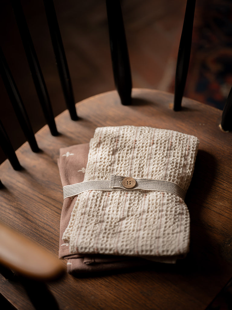 Soft and nostalgic with a hint of countryside whimsy, this tea towel set pairs a delicate bee illustration on a blush pink background with a tactile woven waffle stripe. The gentle contrast of pattern and texture adds charm and lightness to everyday kitchen rituals.