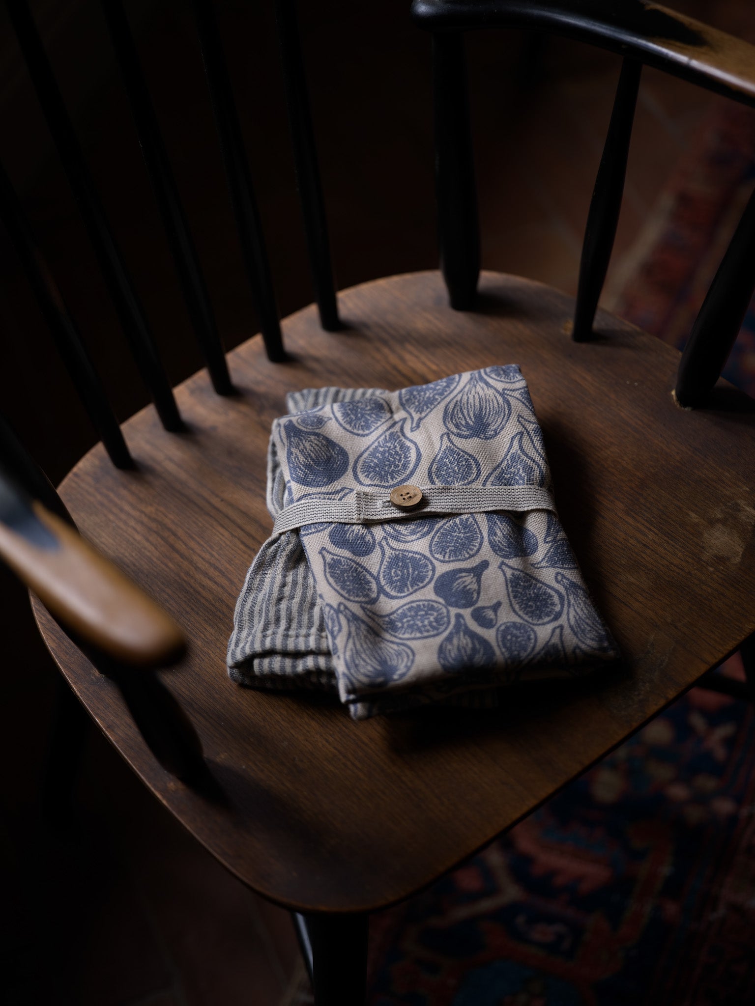 A fresh take on country kitchen styling, this blue-toned tea towel set features a hand-drawn fig motif rich in character and detail, paired with a classic ticking stripe for a clean, modern finish. The balance of illustrative charm and timeless pattern brings refined rusticity to everyday kitchen textiles.
