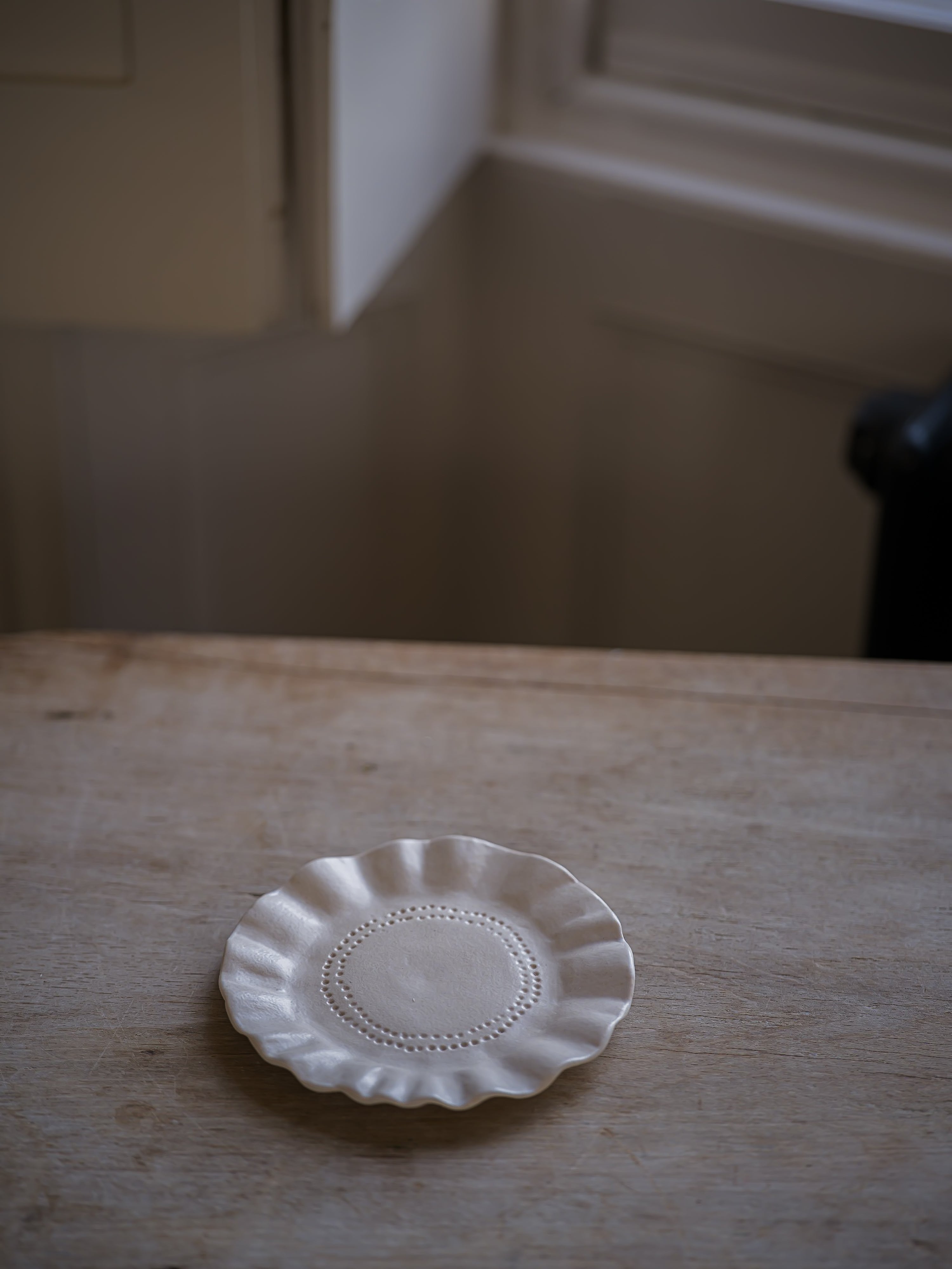 A stoneware plate from the Studio Collection, designed to be layered and combined with other pieces across the range. Made in small batches and finished in a soft neutral glaze, each plate is hand painted and features a gently frilled edge with fine dot detailing, giving it a crafted, hand-finished feel.