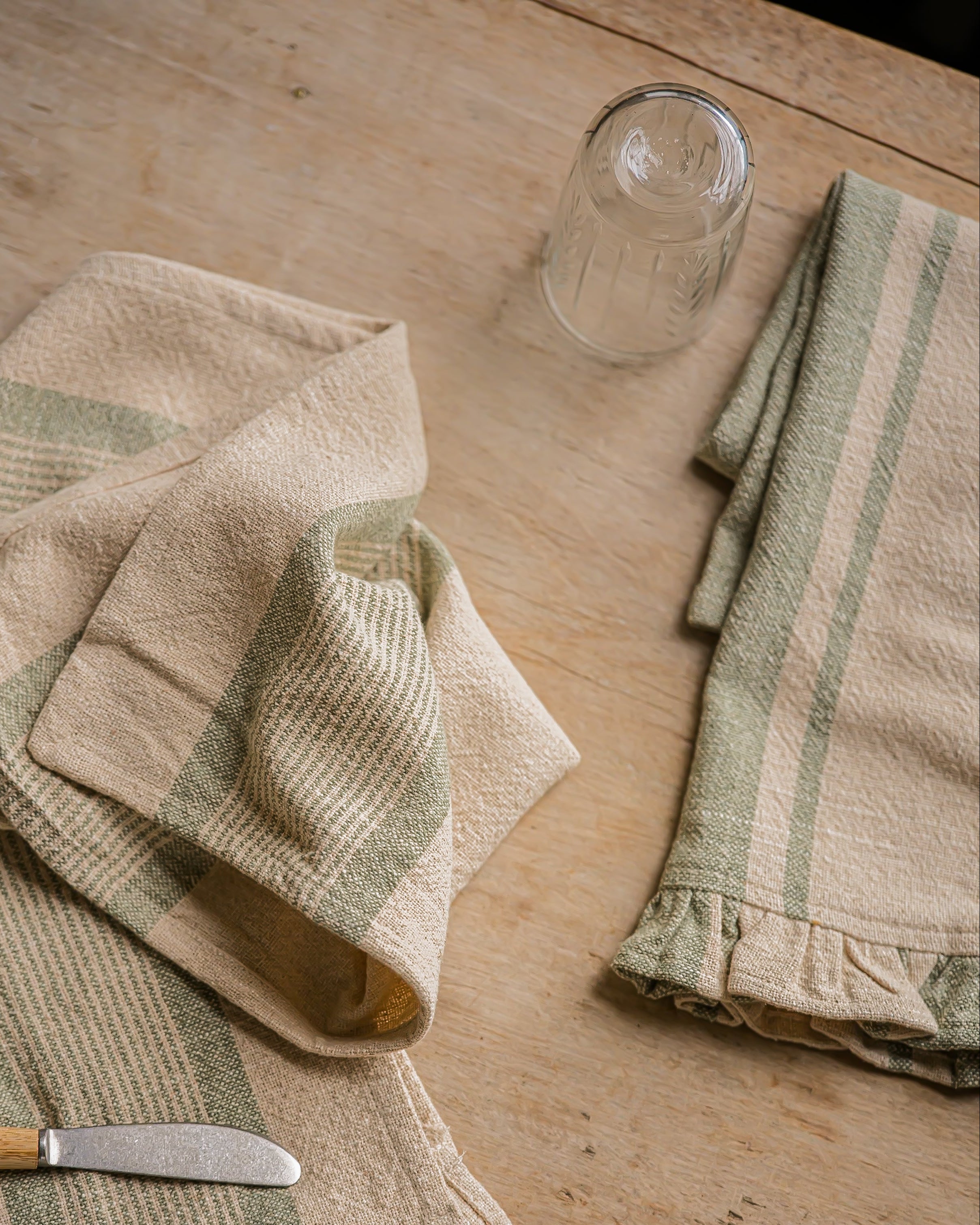 Crafted from cotton and finished with timeless stripes, this set of tea towels combines one frilled design with one plain-edged style, offering a practical everyday pairing with added detail. Available in sage, brick and denim, they bring subtle colour while remaining easy to style.