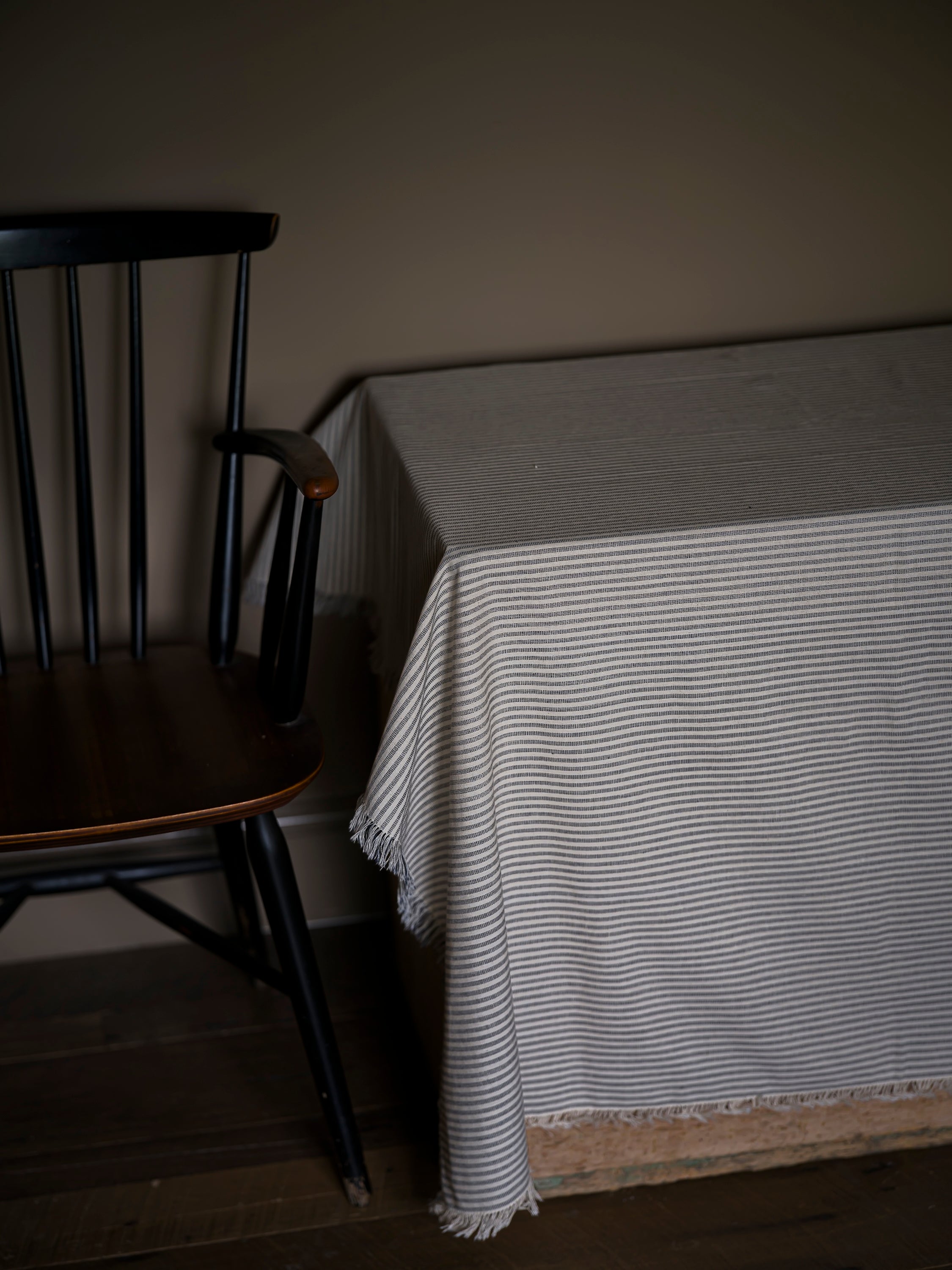 Classic and versatile, this ticking stripe tablecloth is a staple for every season. Woven from a soft, durable cotton blend with a fine, balanced stripe, it brings a sense of quiet order and understated charm to any dining setting.