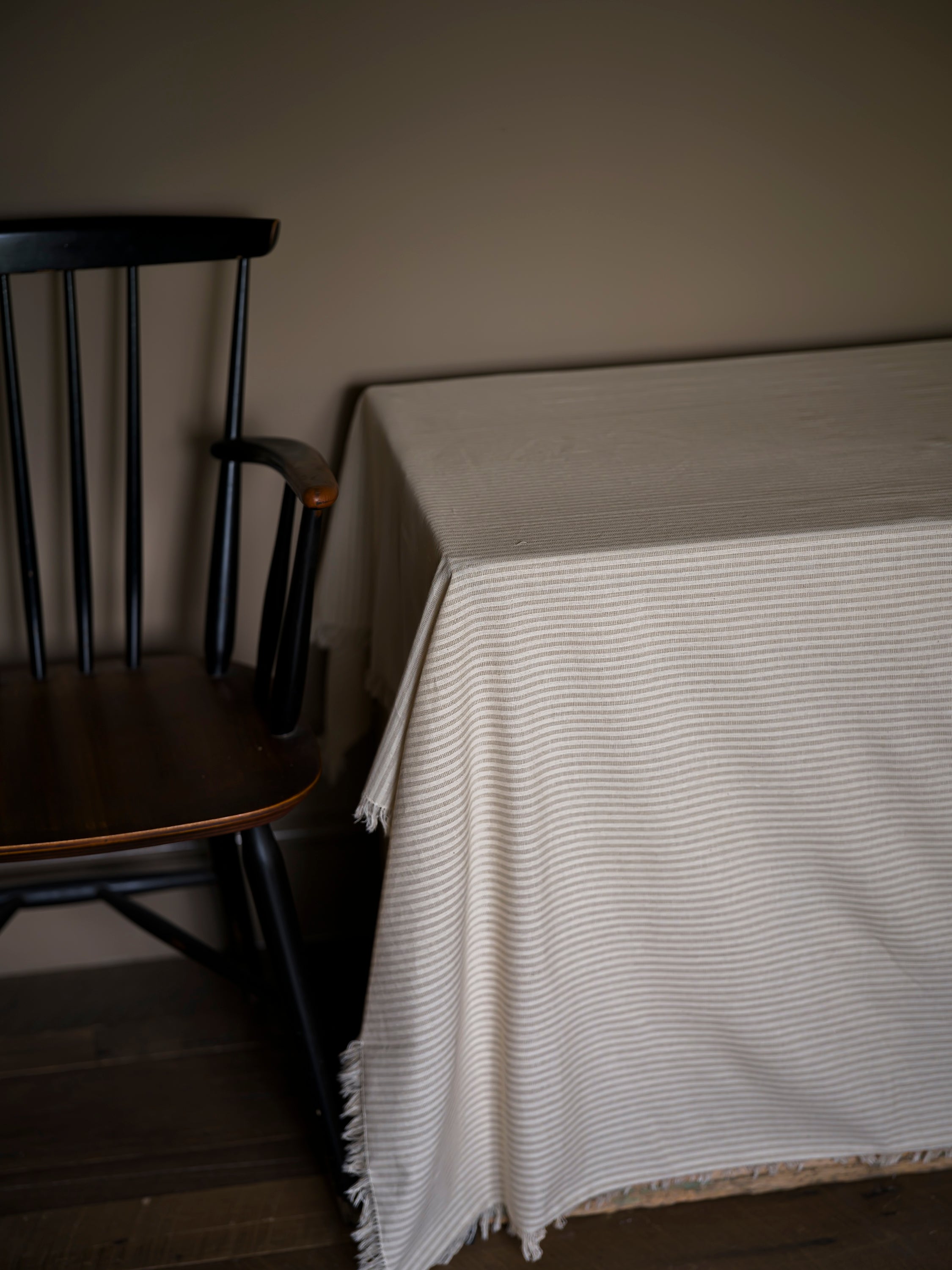 Classic and versatile, this ticking stripe tablecloth is a staple for every season. Woven from a soft, durable cotton blend with a fine, balanced stripe, it brings a sense of quiet order and understated charm to any dining setting.