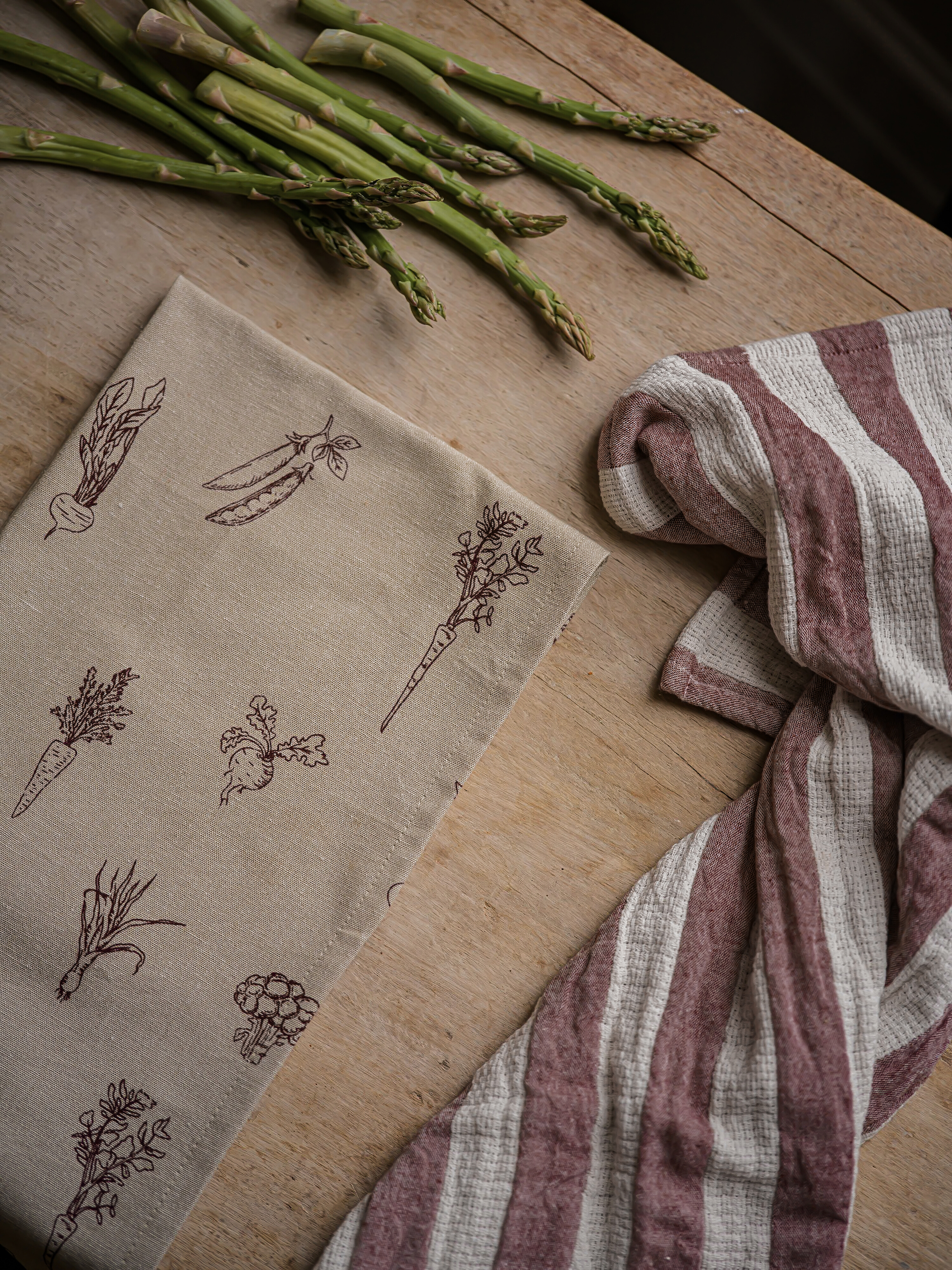 This tea towel set brings together Raine & Humble’s hand-drawn vegetable illustrations with a coordinating broad stripe design, creating a considered pairing for everyday kitchen use. 2 Pack.
